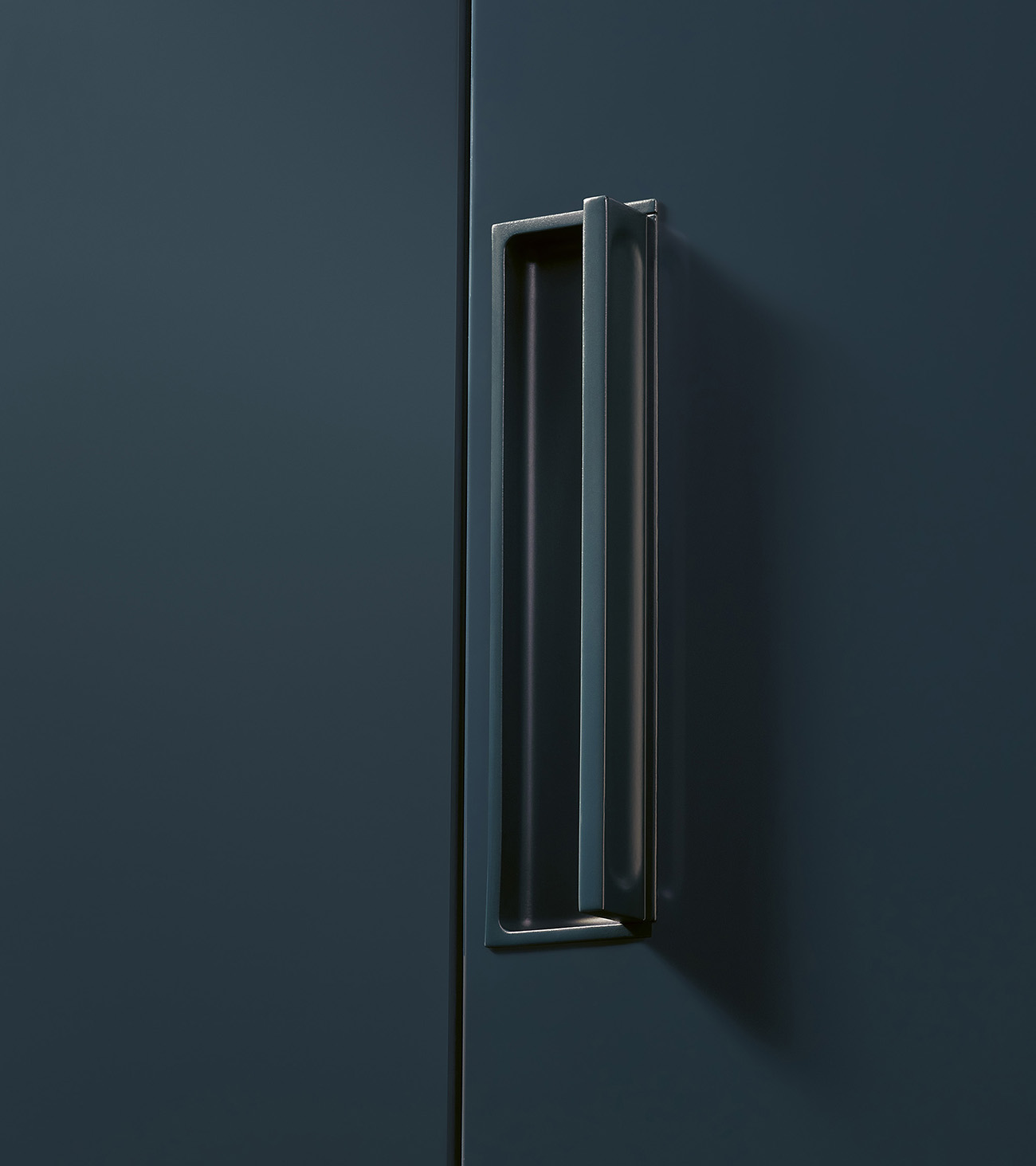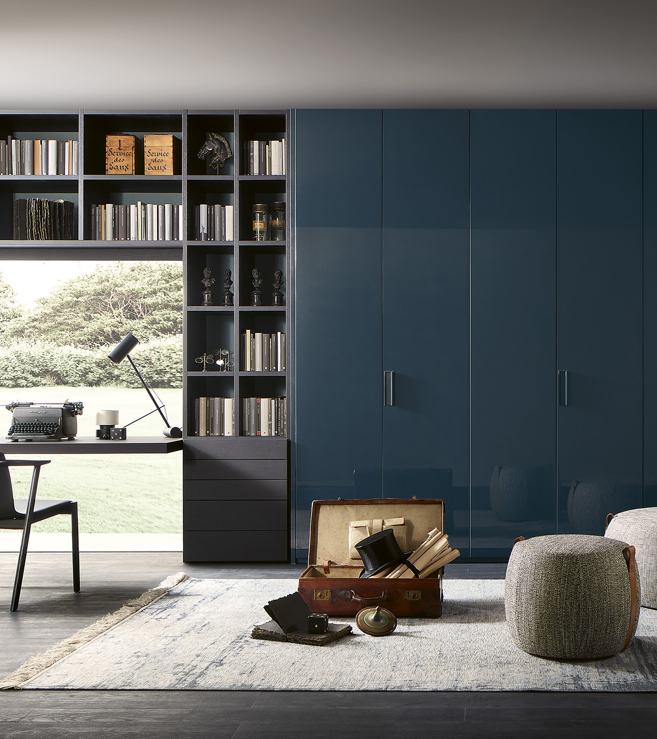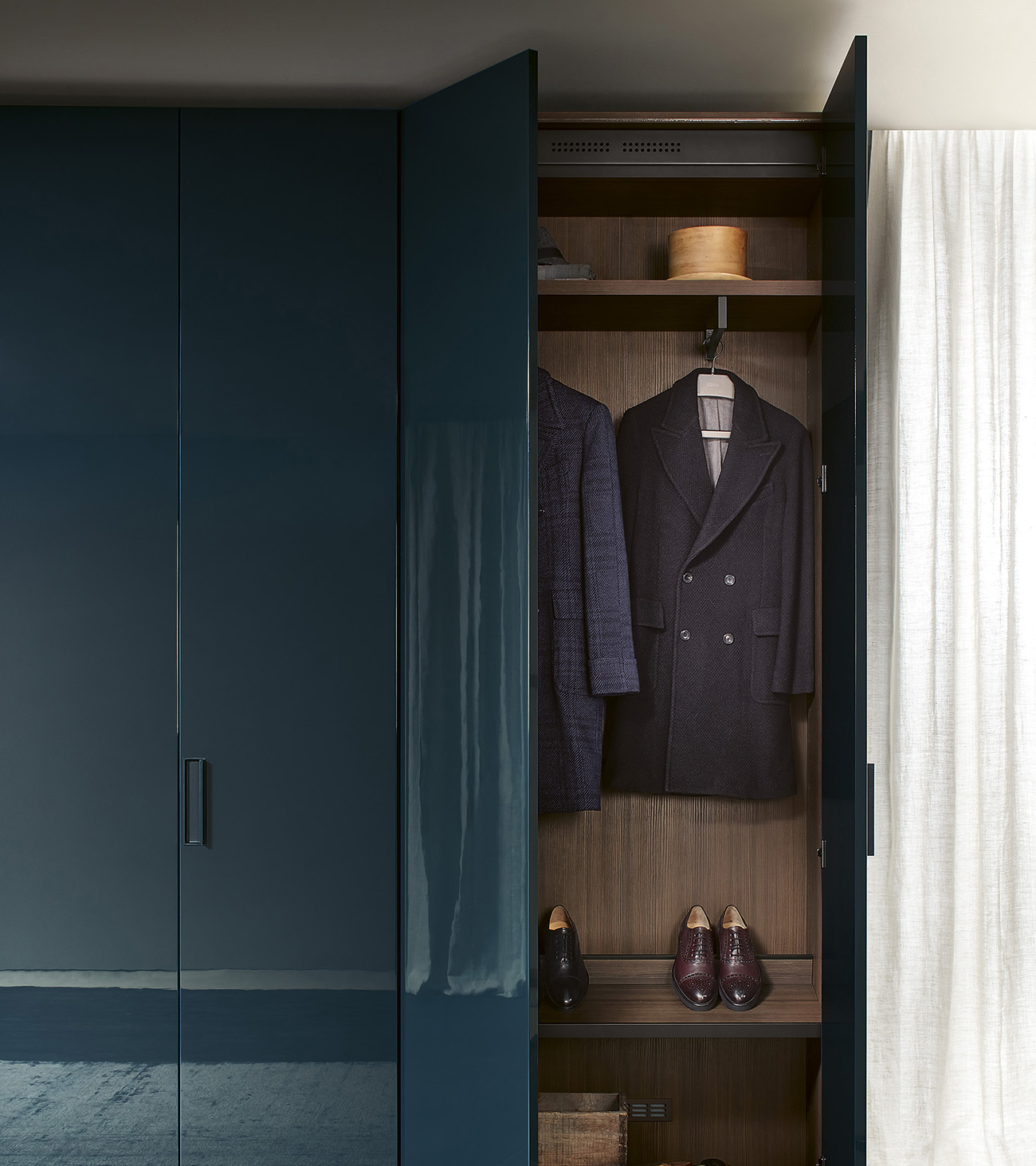 Drawer units, trouser racks, belt racks, shoe racks; shelves and clothes rails with integrated lighting. Not to mention exquisite details in leather and fabric, such as drawer mats and shirt box organizers. Available in lacquered, matte or glossy finishes, wood or melamine, and the door can also be personalized by selecting from the 17 handle options included in the collection.