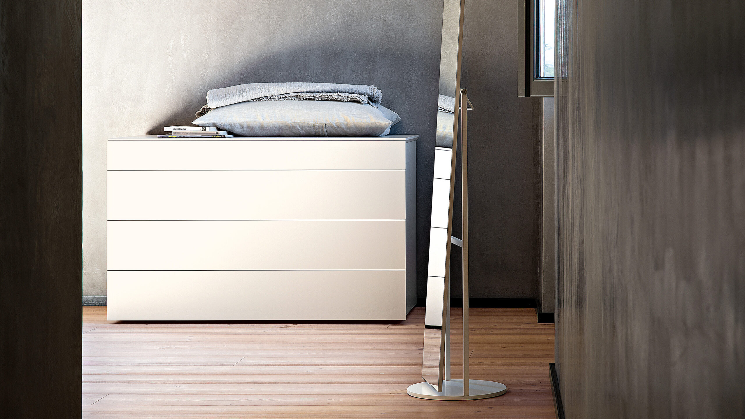 Quarantacinque by LEMA, designed by Officinadesign Lema, is a collection of bedroom storage units with a minimal and modern style, characterized by refined 45-degree angles that define their elegance. Nightstands and dressers in matte lacquer fit easily into both the bedroom and the living area, enriching any space with understated functionality. Made with certified low-emission materials, durable polyurethane lacquered finishes, and high-quality construction details, Quarantacinque combines aesthetics, durability, and sustainability in a product that is authentically Made in Italy by LEMA.