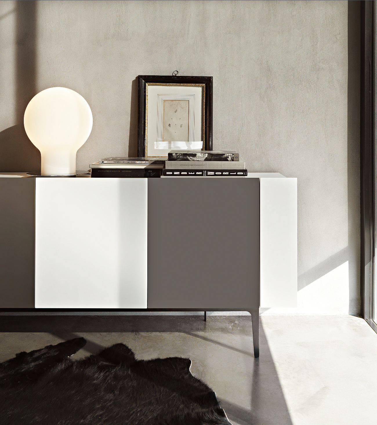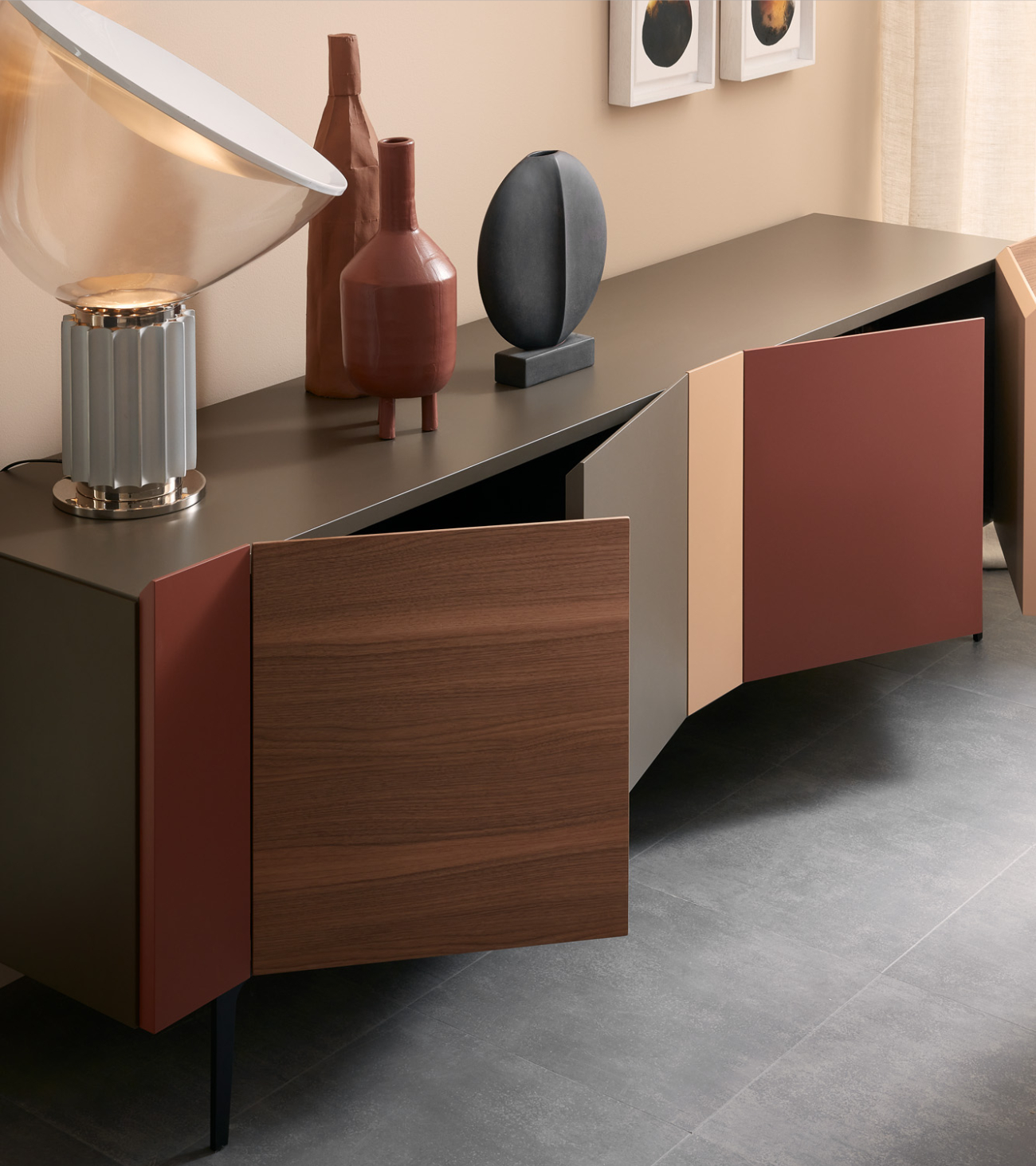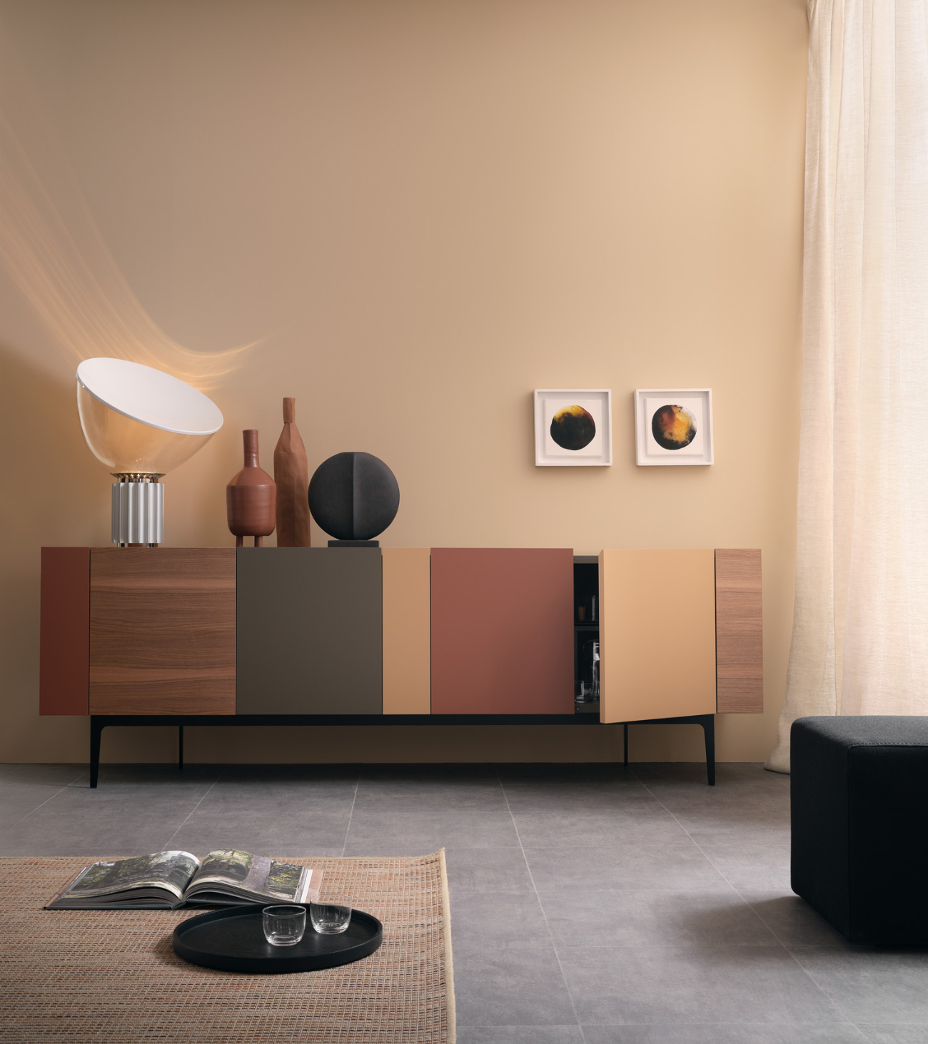 Roberto Lazzeroni, with his defined style, revives traditional forms in a container for the living area with a distinctly contemporary spirit. The four-door Rainbow sideboard stands out for its suspended metal base with a vintage mood and the captivating graphic design of the version with a facade characterized by the chromatic pattern that also inspired its name.