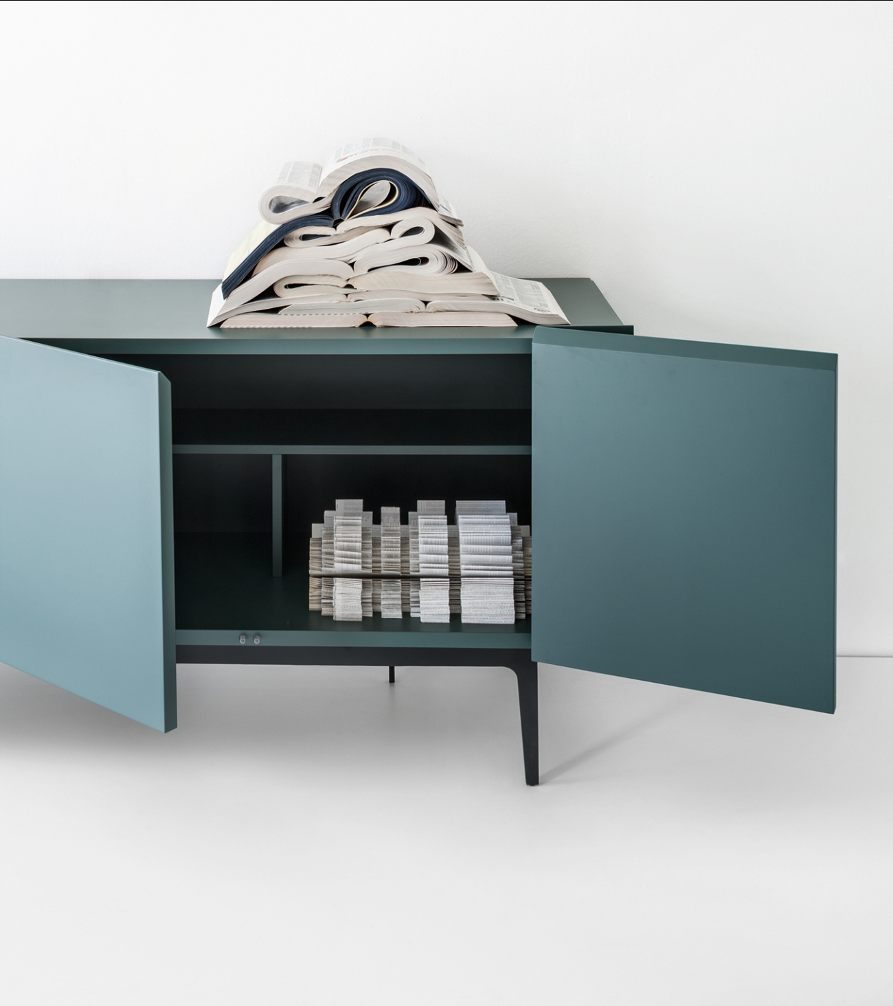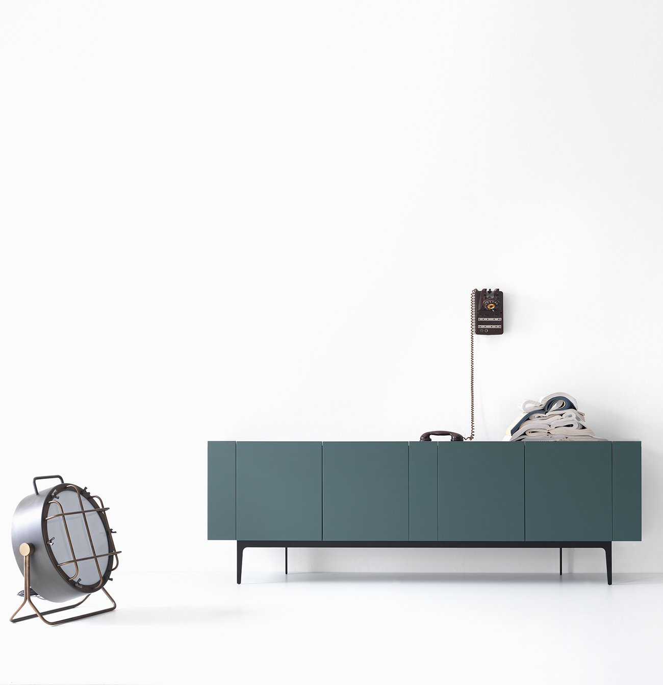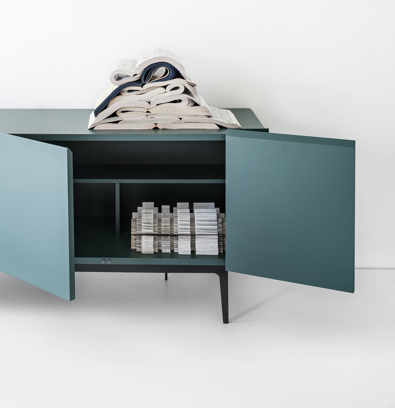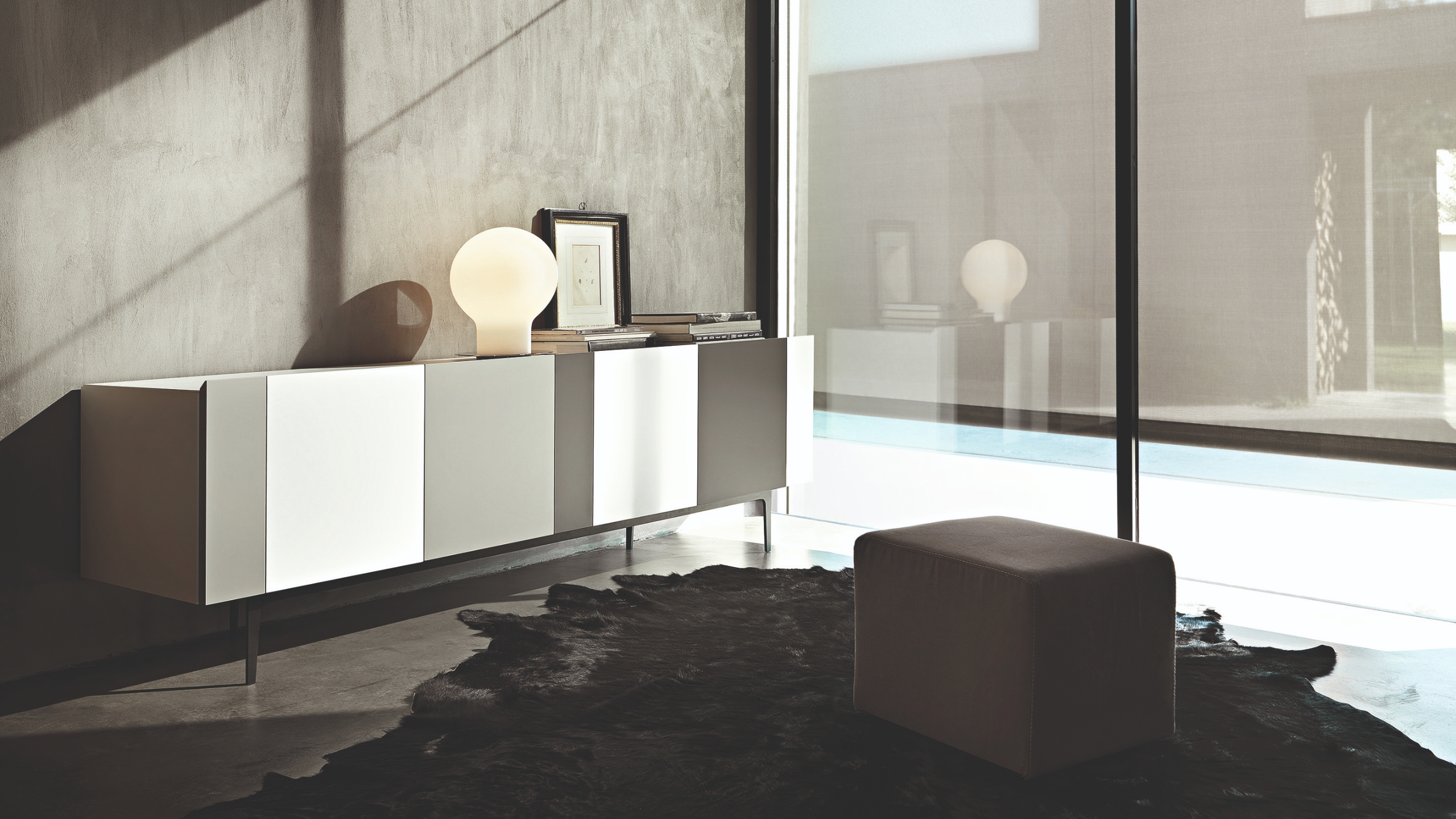 Roberto Lazzeroni, with his defined style, revives traditional forms in a container for the living area with a distinctly contemporary spirit. The four-door Rainbow sideboard stands out for its suspended metal base with a vintage mood and the captivating graphic design of the version with a facade characterized by the chromatic pattern that also inspired its name.