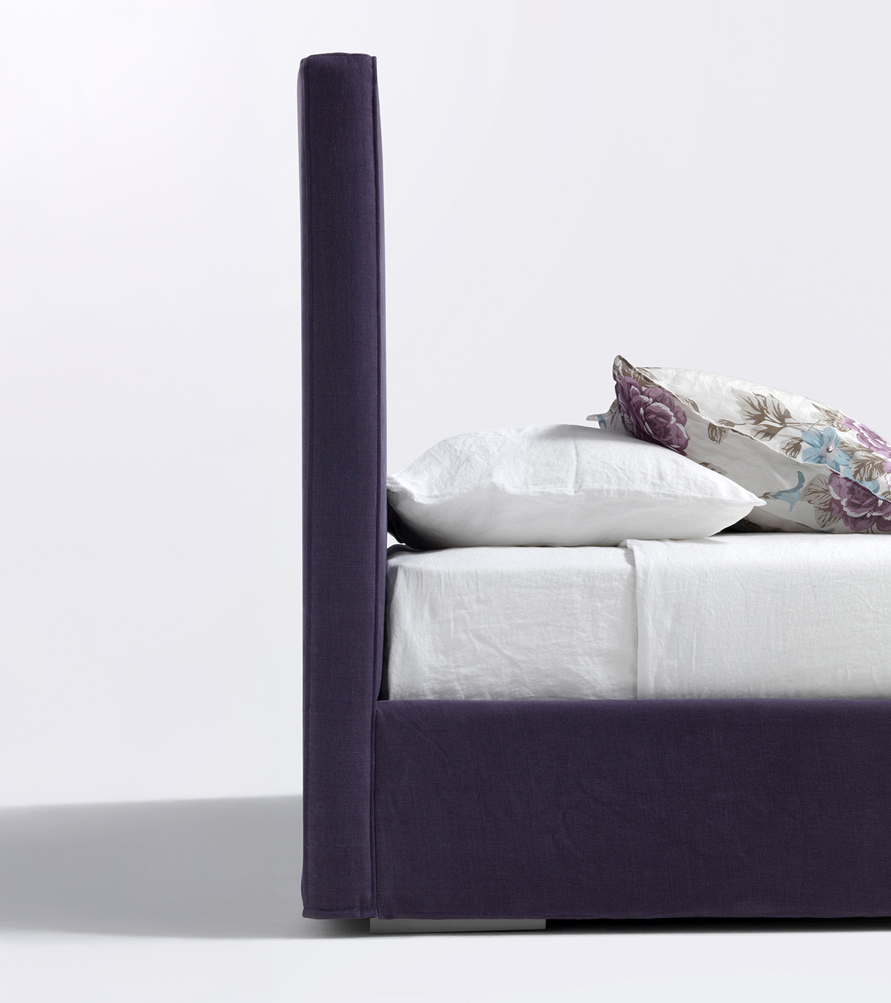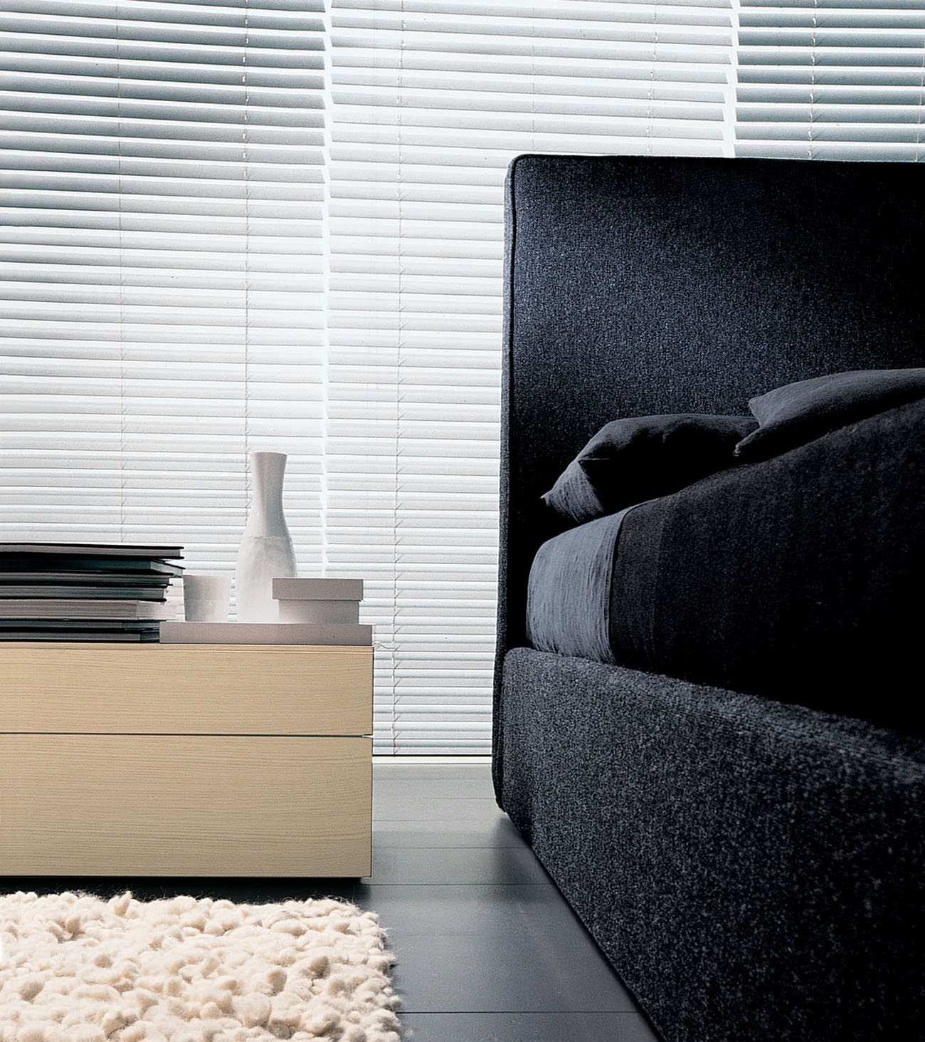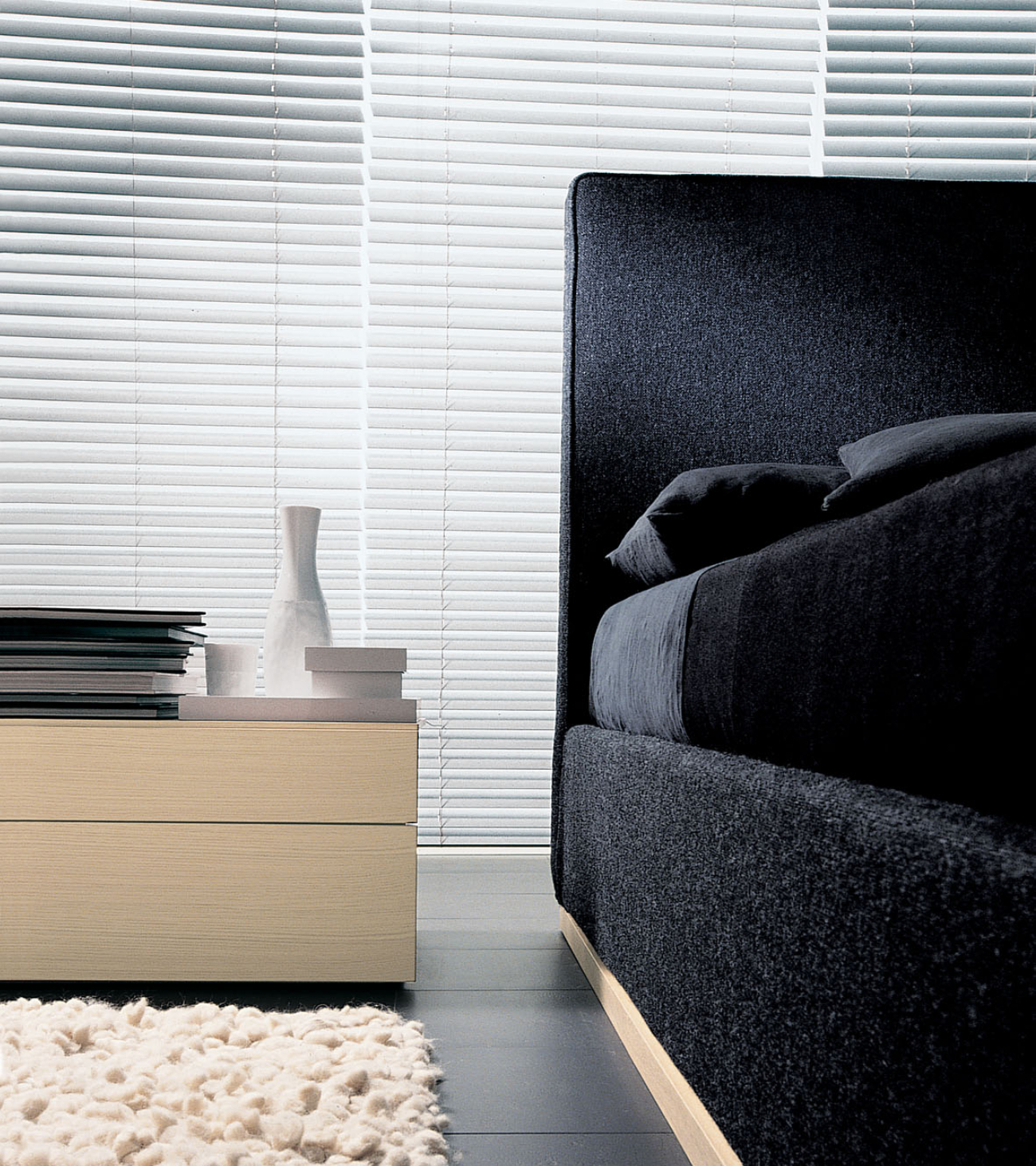 Strict and linear shapes characterize Semillon by Officina design Lema, a double bed distinguished by its high, fully removable padded headboard. Its essential lines make it suitable for any type of bedroom.