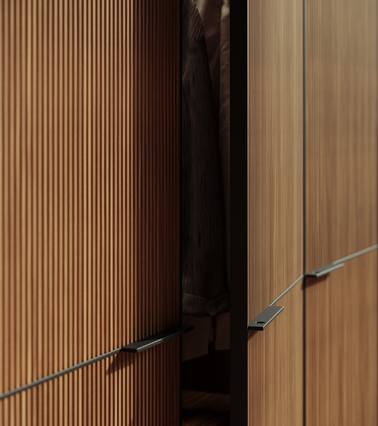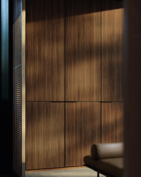Designed by David Lopez Quincoces, the Seryasse Armadio al Centimetro Wardrobe with hinged doors is defined by its vertical, tightly spaced rhythm created by the micro-slat aesthetic effect of the doors in solid Canaletto walnut, resulting in a three-dimensional look. Highly tactile, the door features a vertical perimeter frame and an essential, sharply cut, slim handle in bronze-painted metal that adds lightness to the design. A wardrobe with a sophisticated character, conceived for the bedroom area but perfect for organizing storage spaces in other settings as well, thanks to the boiserie effect created by the unique micro-slat detailing that also inspired its name.