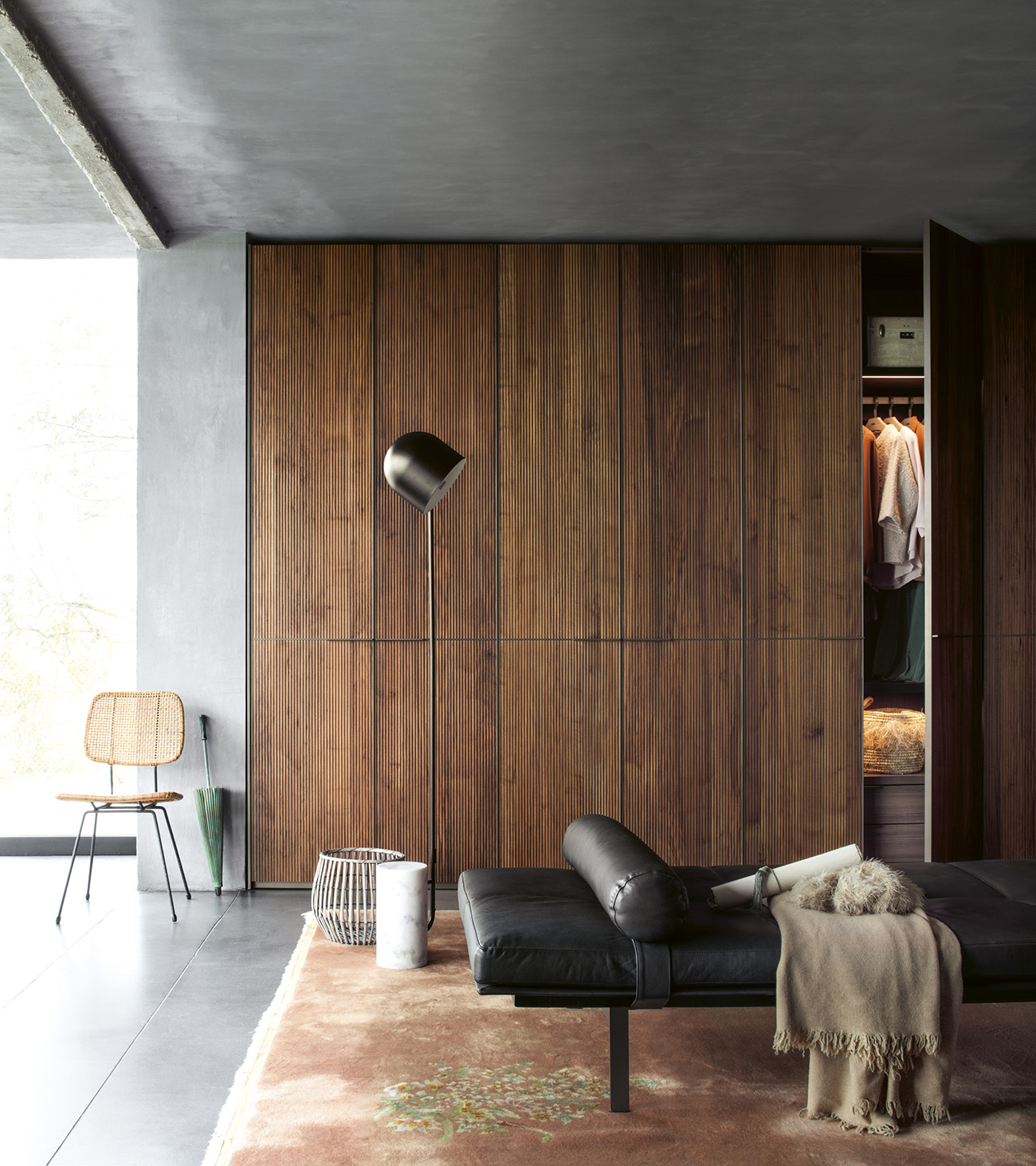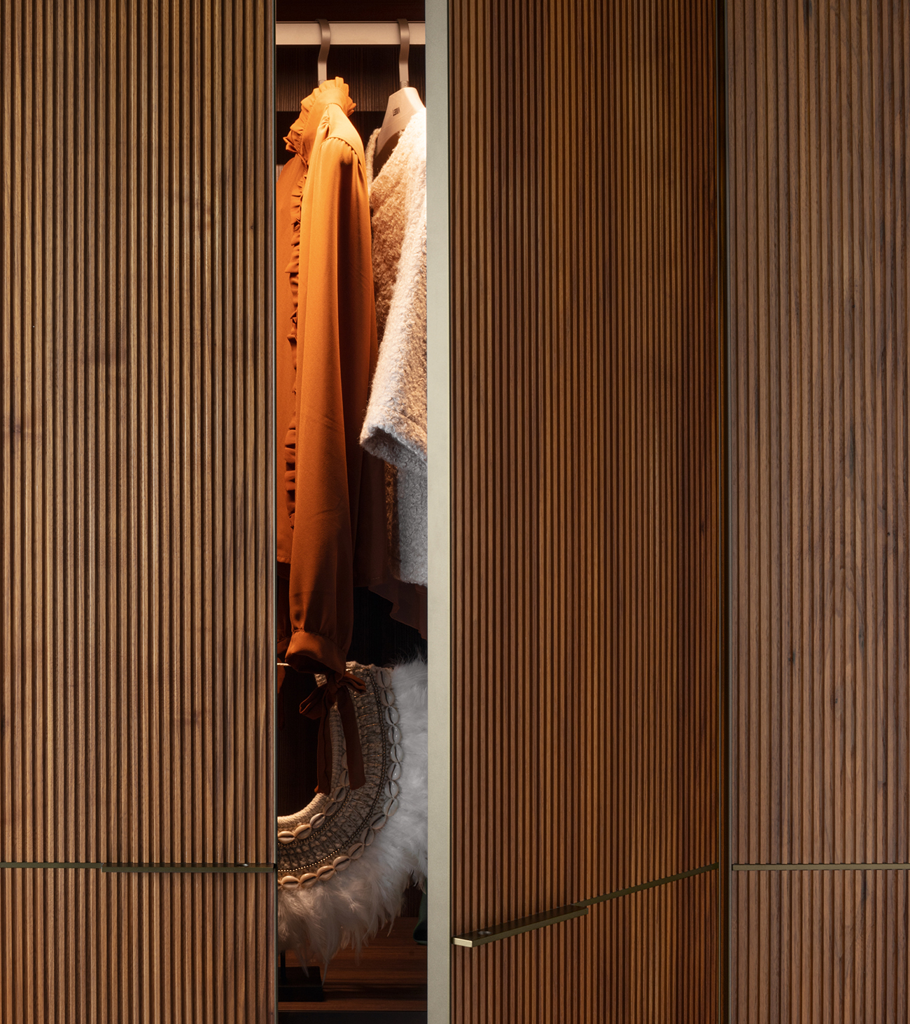 The Seryasse wardrobe by LEMA, designed by David Lopez Quincoces for Officinadesign Lema, is a masterpiece of Italian-made design that combines luxury and craftsmanship. The hinged doors in ribbed Canaletto walnut with bronze aluminum profiles convey material elegance and formal precision. Customizable interiors with the “Armadio al Centimetro” system, LED lighting, and certified materials ensure comfort, quality, and sustainability. In line with the elegance of the Nur wardrobe, Seryasse embodies the contemporary luxury signature of LEMA.