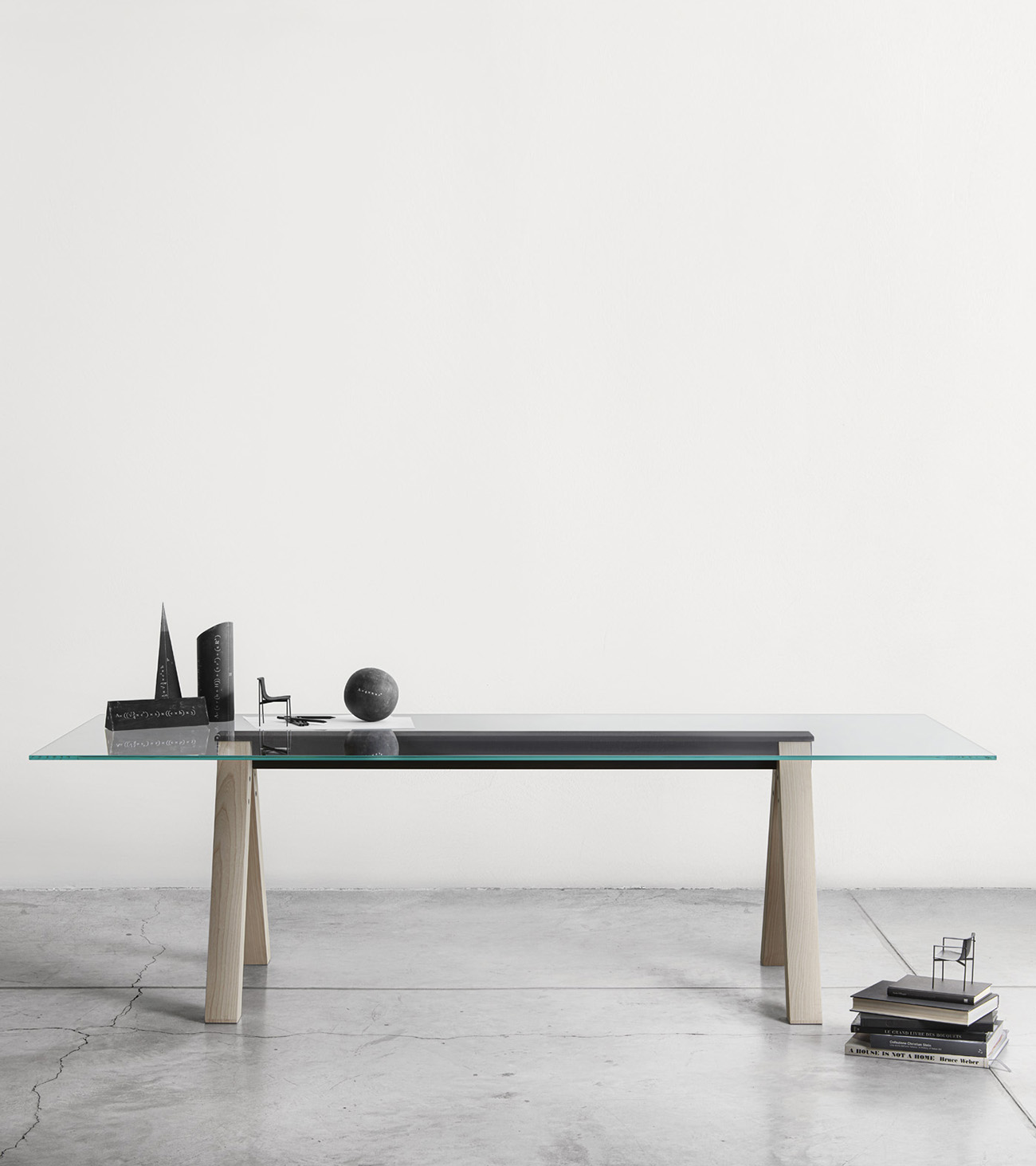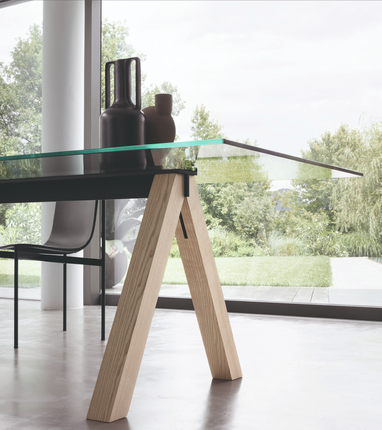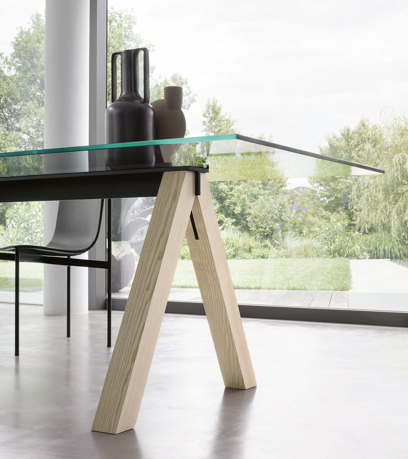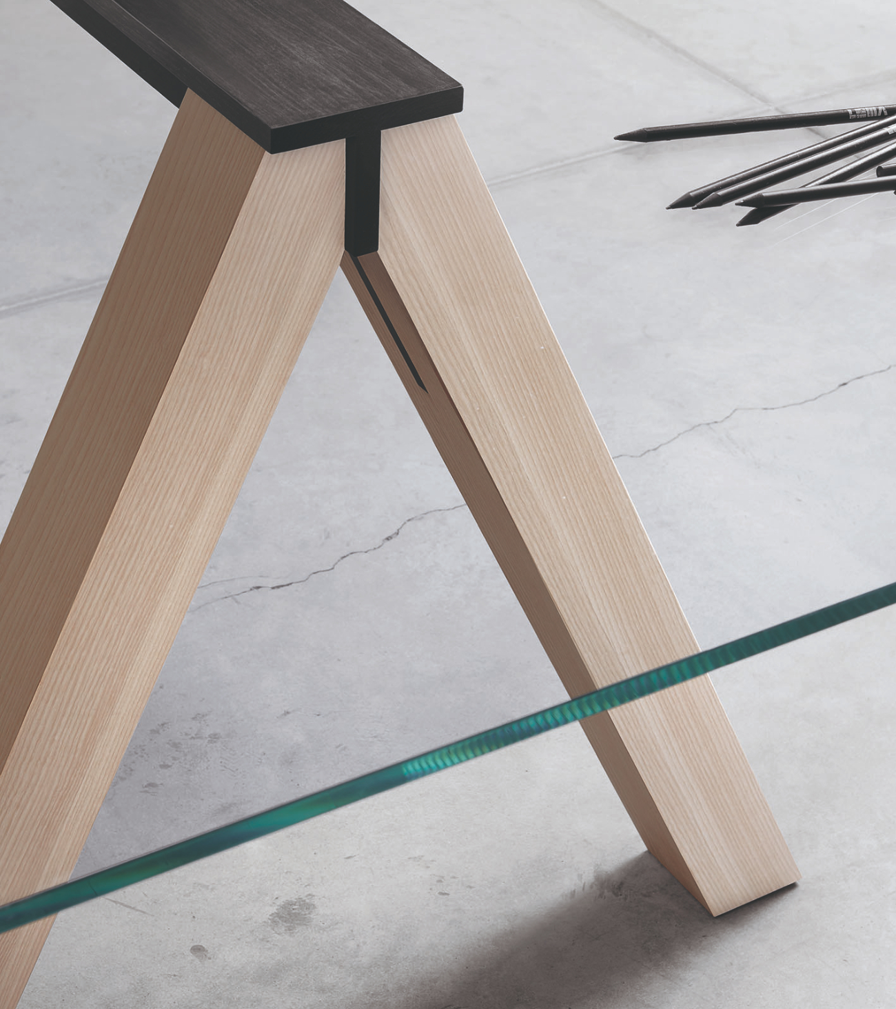 The apparently simple architecture hides a sophisticated detail in the construction of the leg, where the T-shaped element supporting the top fits into the trestle. Another distinctive feature is given by the combination of materials: the extra-clear glass top, the wooden legs, and the metal support.