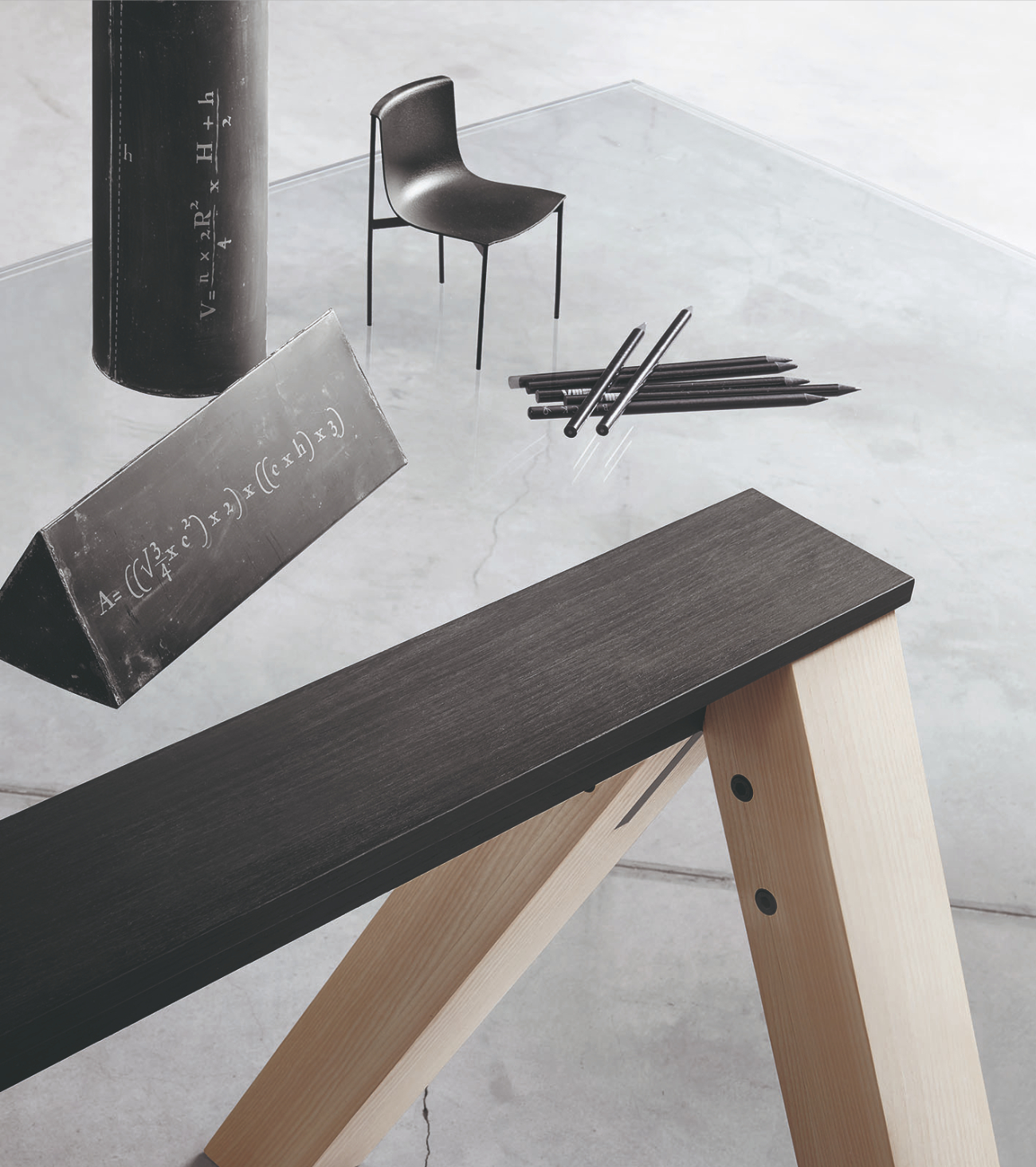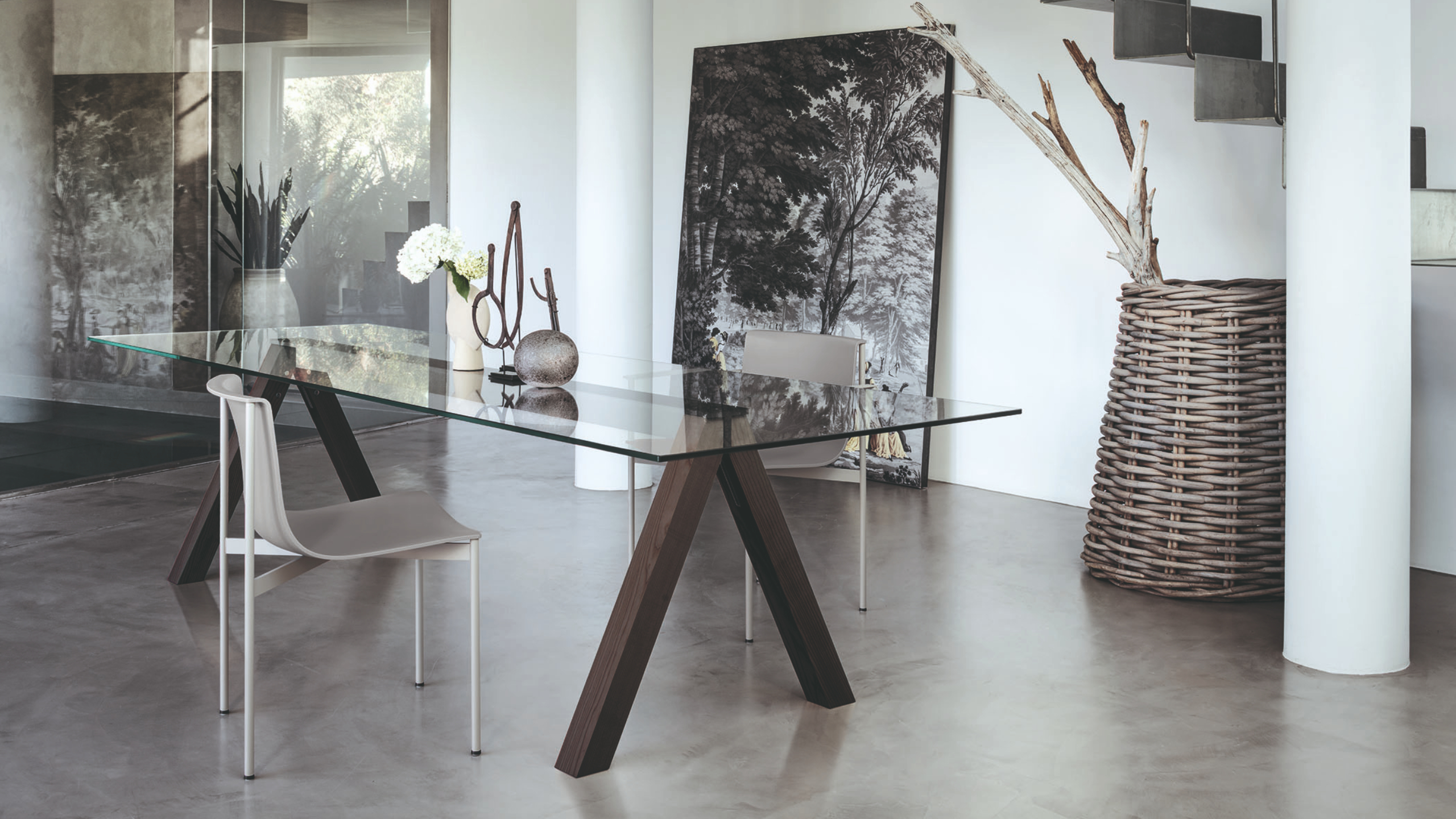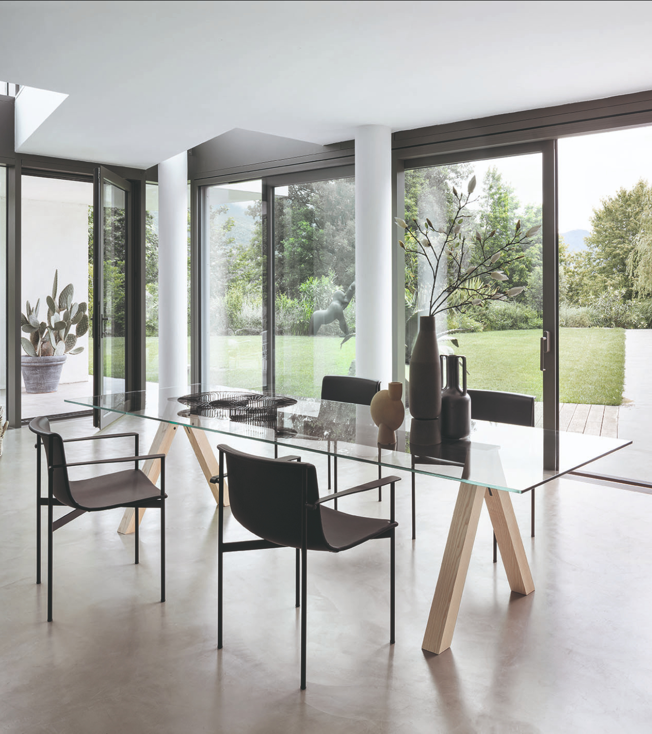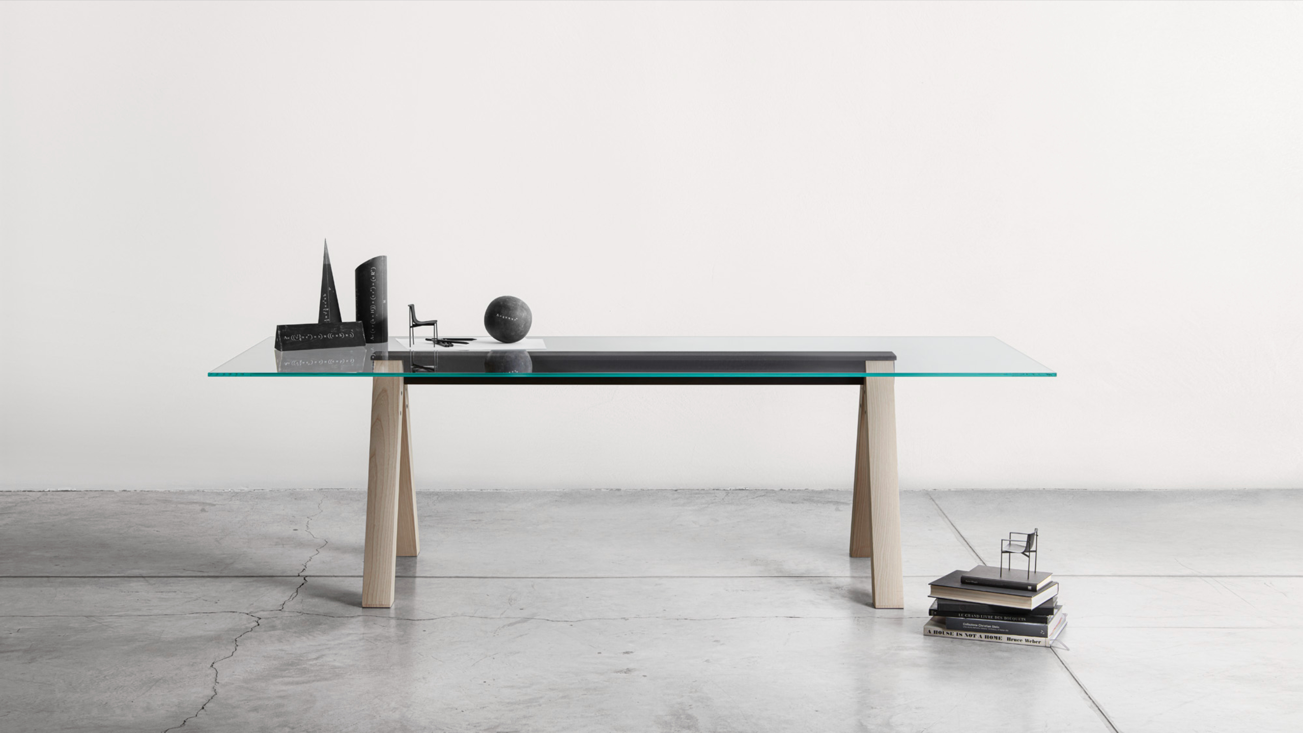 The apparently simple architecture hides a sophisticated detail in the construction of the leg, where the T-shaped element supporting the top fits into the trestle. Another distinctive feature is given by the combination of materials: the extra-clear glass top, the wooden legs, and the metal support.