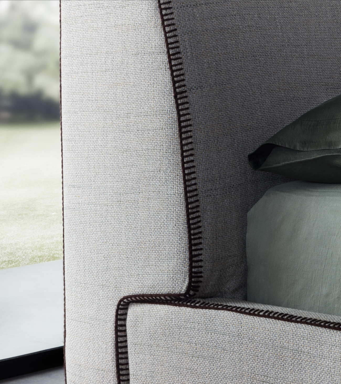 Linear design for the Softland double bed by Ludovica and Roberto Palomba with padded and removable structure, upholstered in leather or fabric. The profile is enhanced by contrast saddle stitching, a refined detail that highlights its shapes.