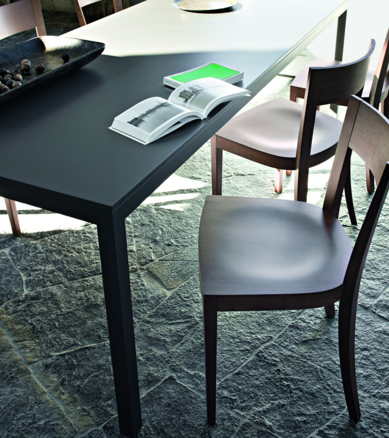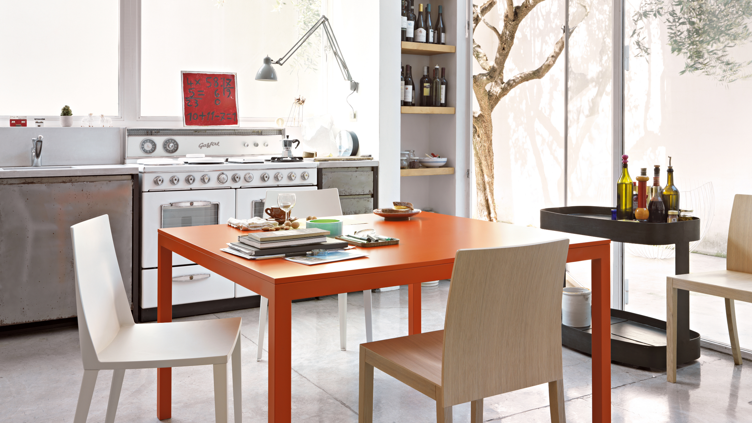 Simple and at the same time versatile: the Sosia table designed by Vittorio Prato stands out for its painted metal structure that houses a top available in wood, lacquered, or glass.