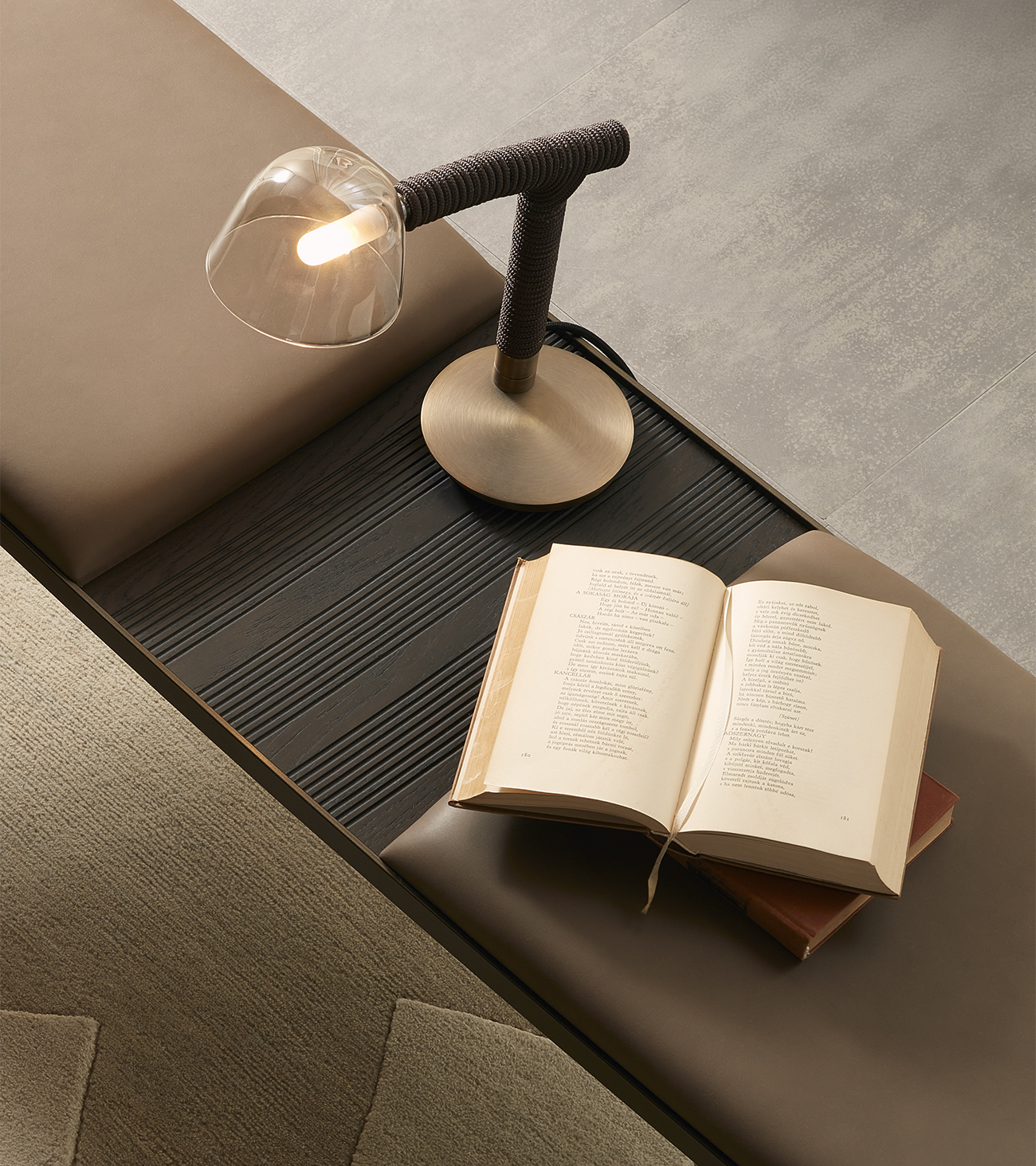 Its sophisticated character is identified in the simplicity of the lines and their movement, emphasized by the combination of different materials: the double structure in bronze-painted metal that houses the padded seat with double cushion in leather or eco-leather, alongside a part left free, on the side or in the center, where a tray in thermo-treated oak is integrated into the structure, with grooved inserts, designed as an empty-pocket tray.