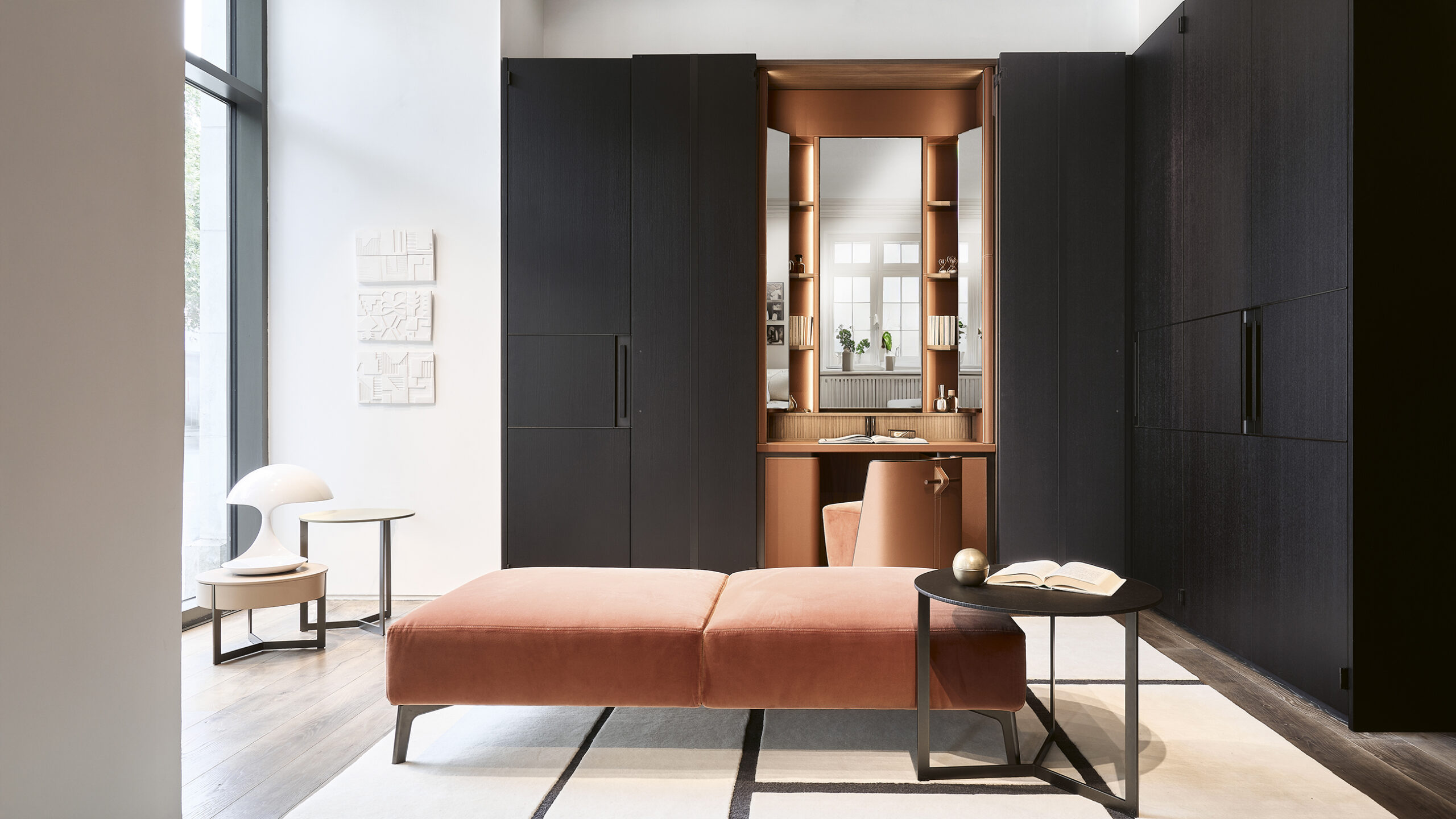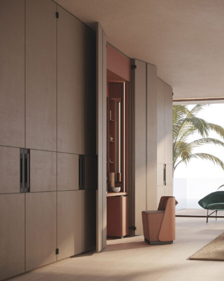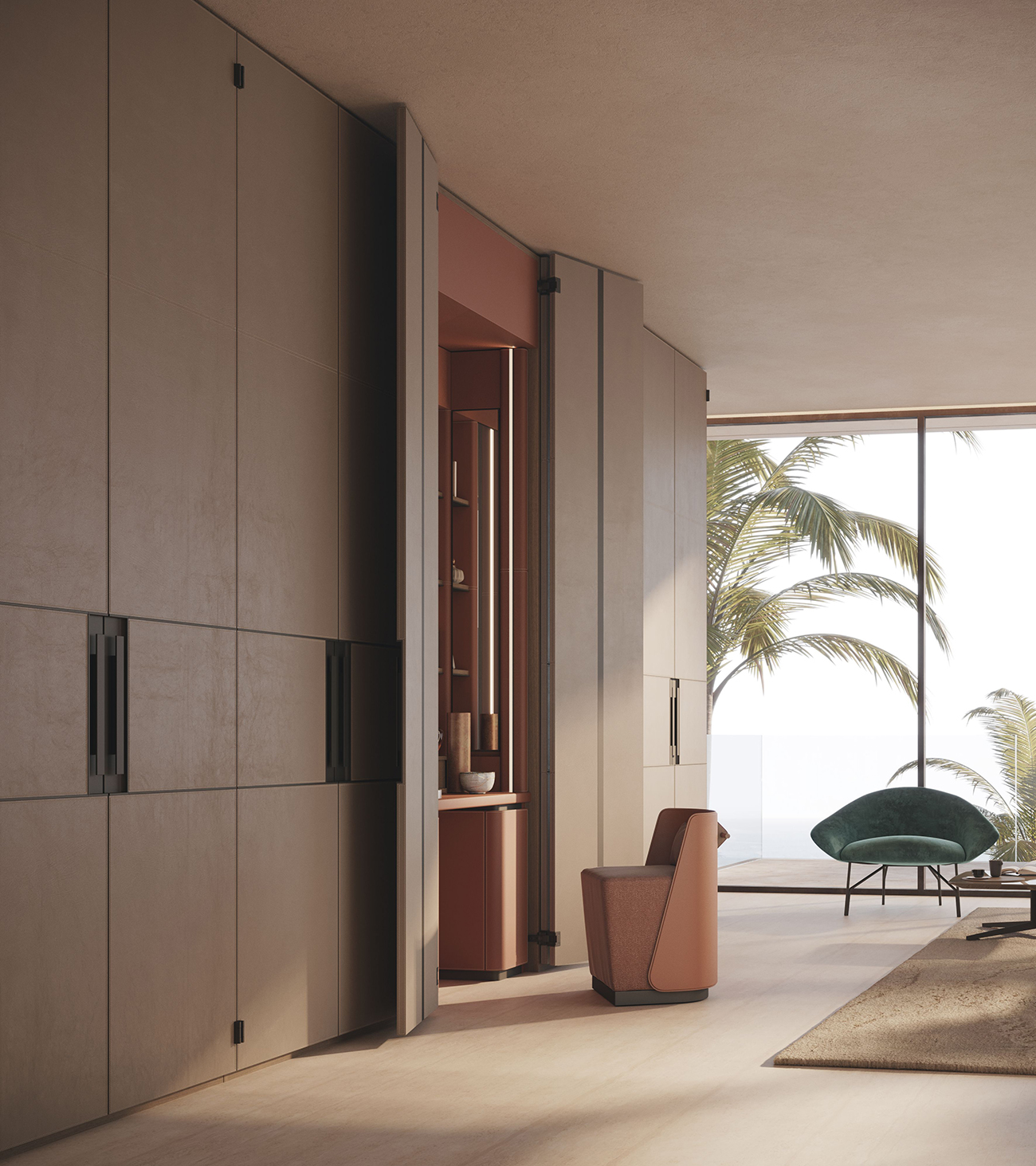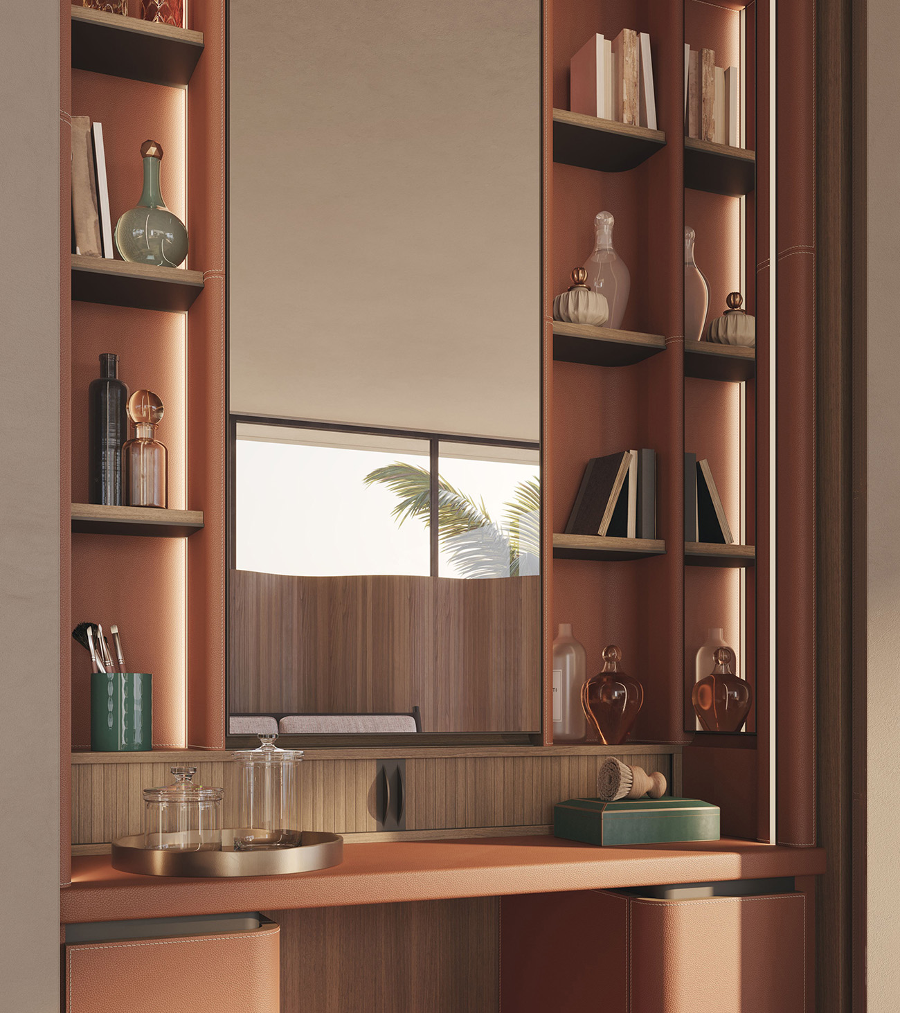The Eureka Vanity by LEMA, designed by Steve Leung, expresses the allure of timeless luxury in a contemporary way. This “all-in-one” system integrates seamlessly into the bedroom area with fully customizable modules. Upholstery in dollar-grain light hide or BASIC leather, adjustable mirrors, dimmable LED lighting, and motorized drawers create an intimate and sophisticated space. Finishes in walnut-L and palladium metal highlight the artisanal quality of Made in Italy. A luxury accent piece that combines understated glamour and versatility, adapting to every lifestyle with aesthetic refinement.