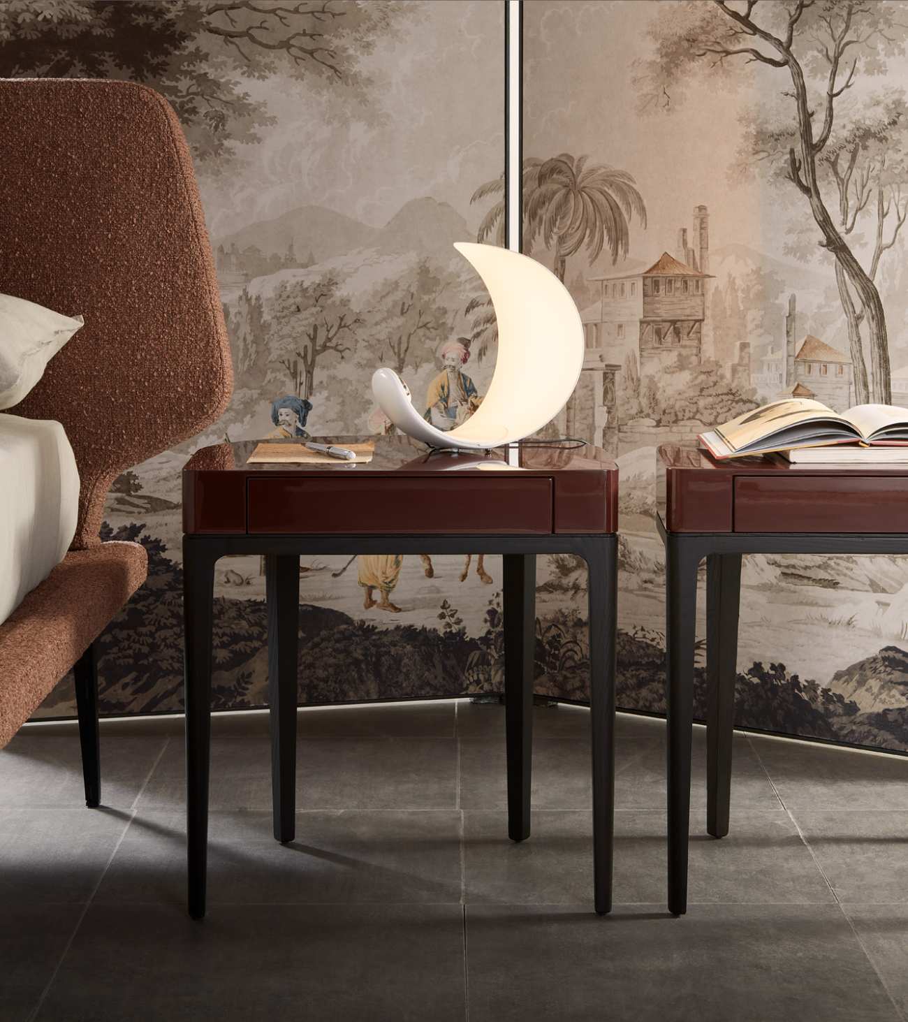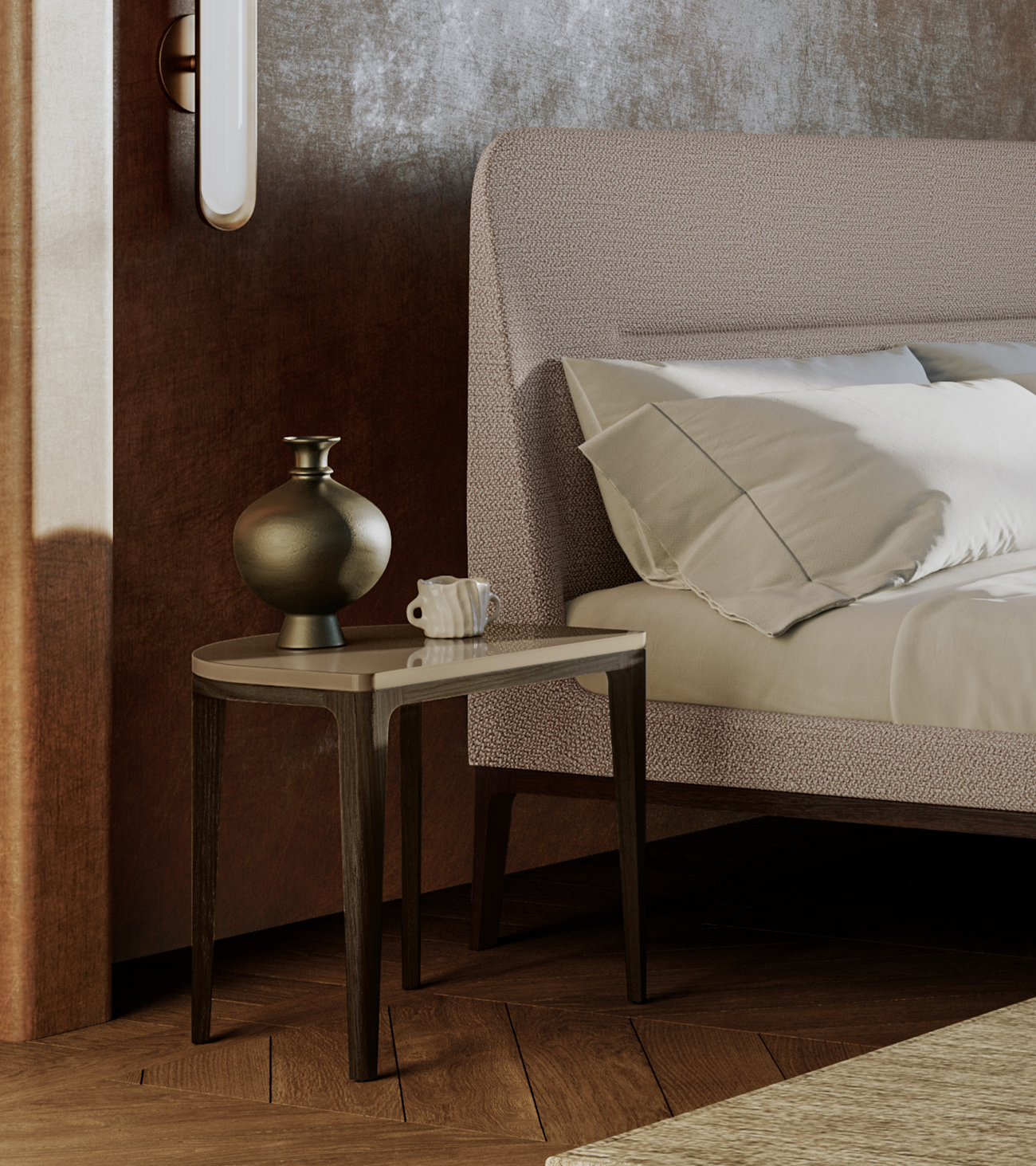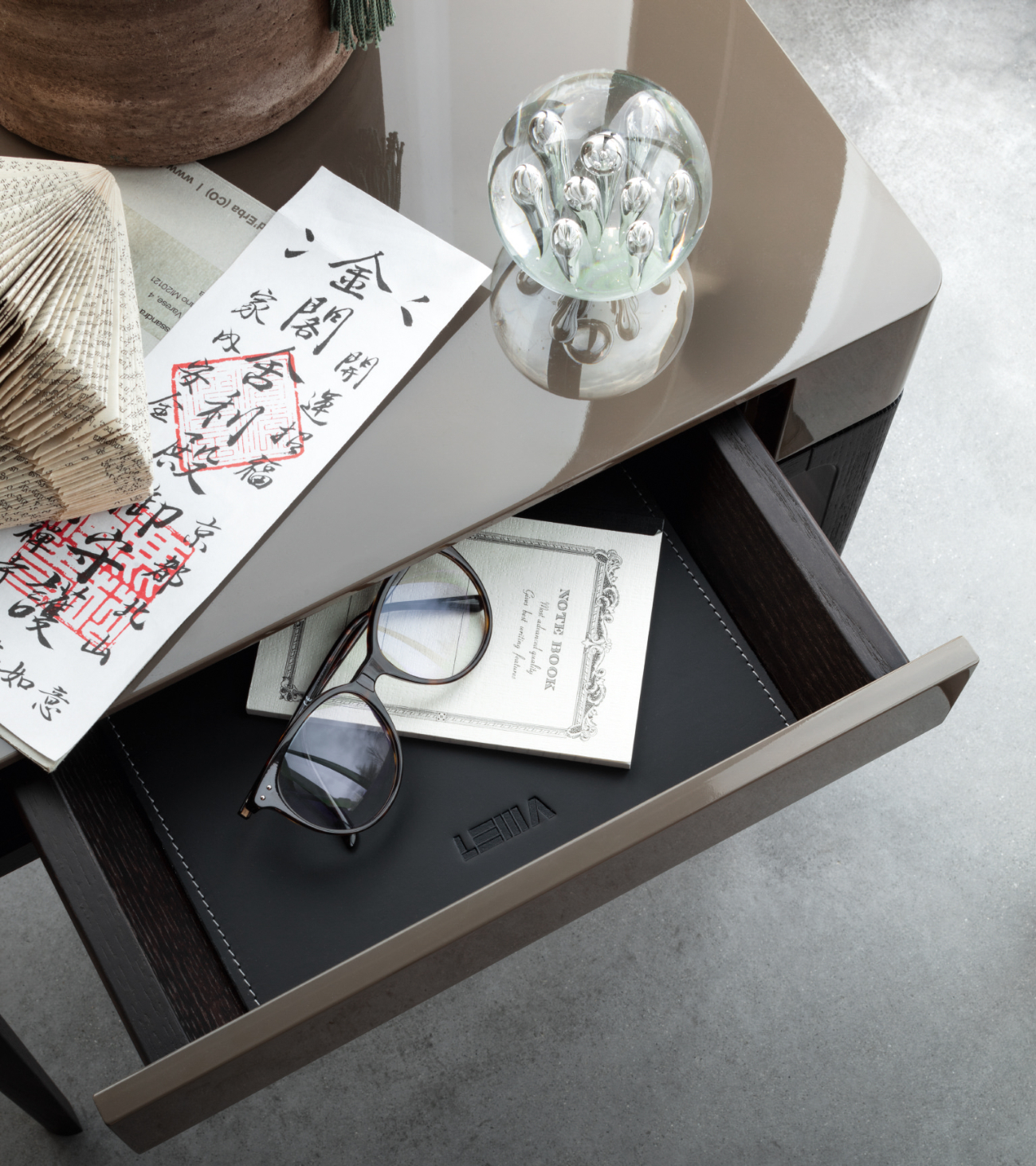 The Vic nightstand by LEMA, designed by Roberto Lazzeroni, combines luxury and functionality in a perfect balance of shapes. The frame in solid ash wood stained thermo-treated oak supports a top in glossy or matte lacquer, also available with a drawer covered in regenerated leather. In the side table version, the marble or stone top with SHIELD® finish enhances the sophisticated design. Vic nightstand is the expression of Lema’s made in Italy, where craftsmanship and luxury interact with timeless elegance.