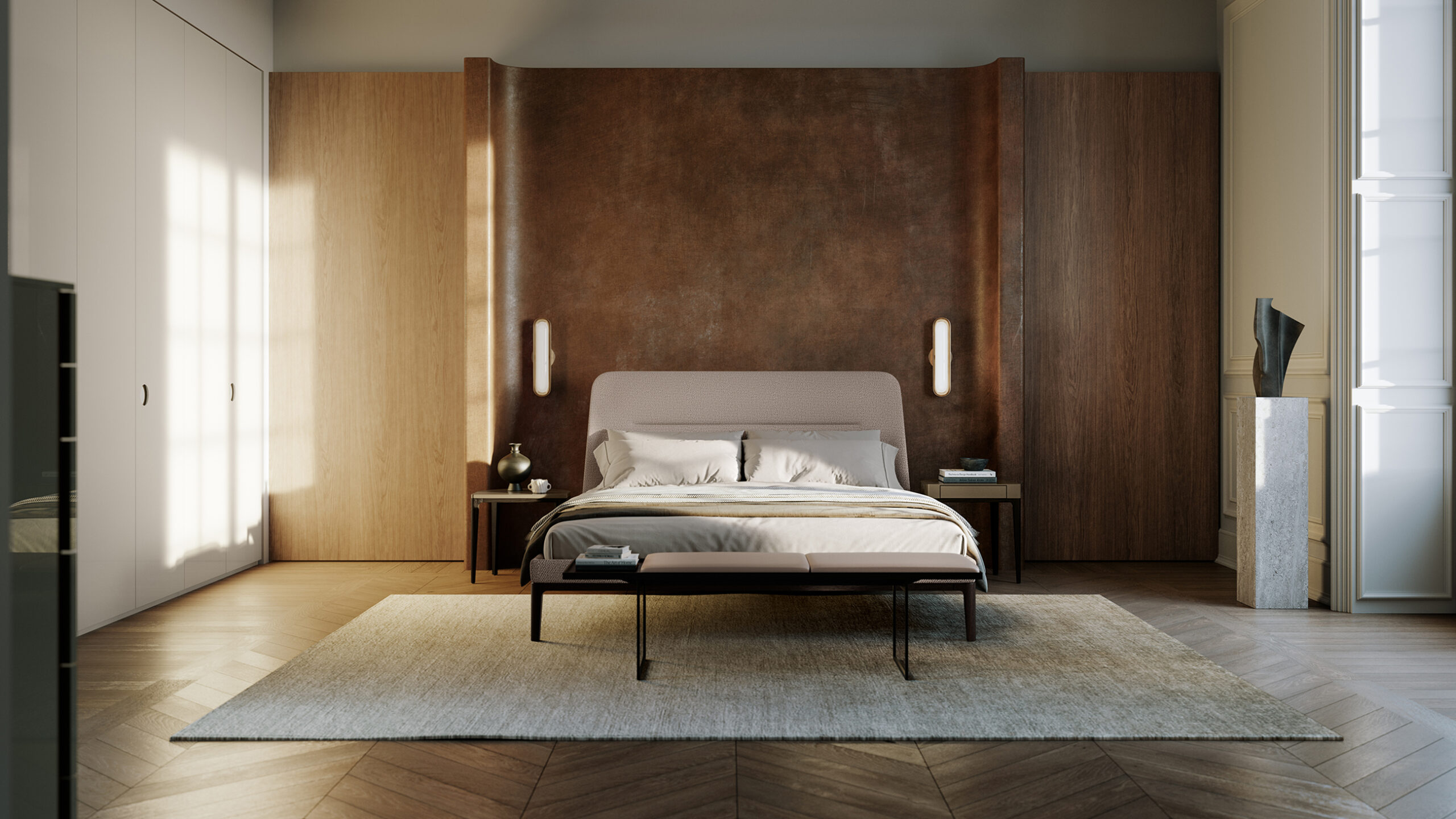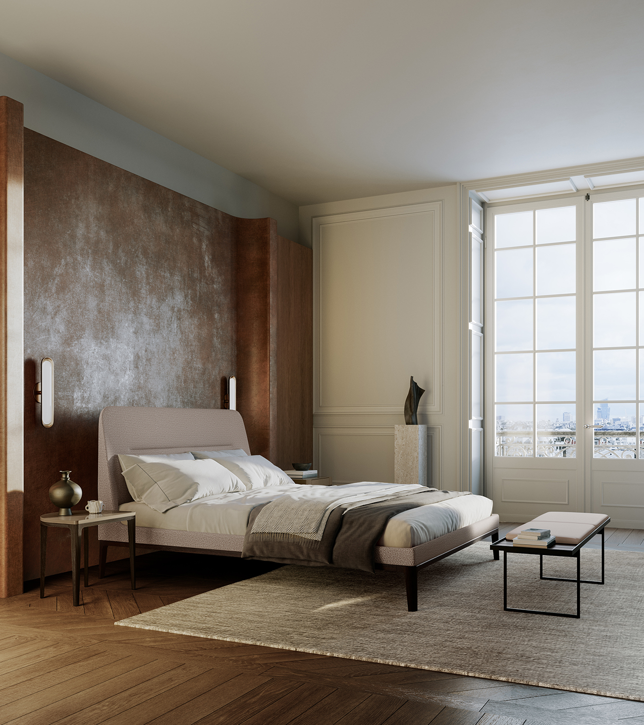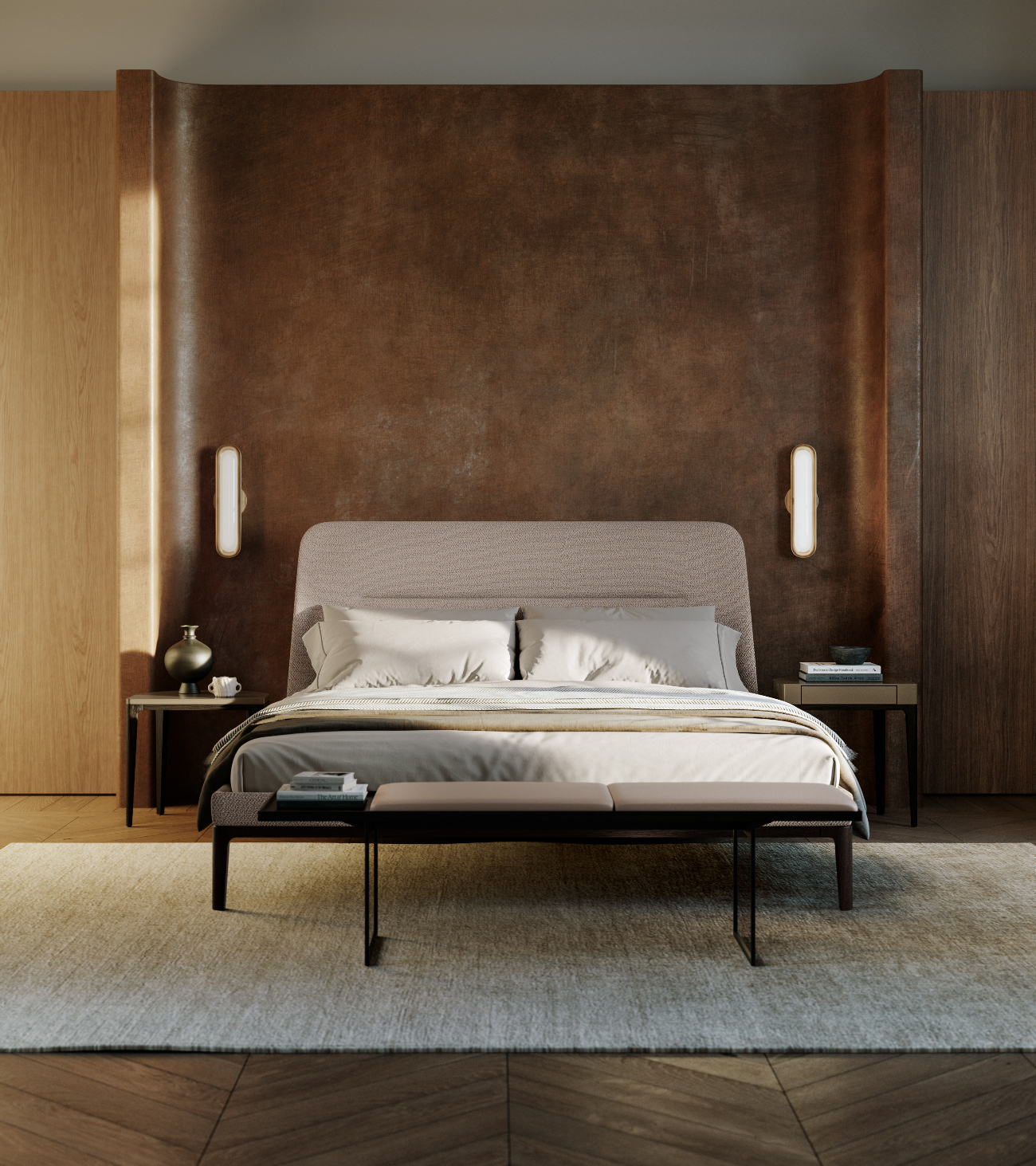 With its regal presence, Victoriano, a textile bed with a solid wood frame, draws inspiration from the styles of the past, updated in its design. The project is strongly characterized by the tall headboard, slightly curved at the sides to gently embrace the mattress, embellished with a central topstitched seam.