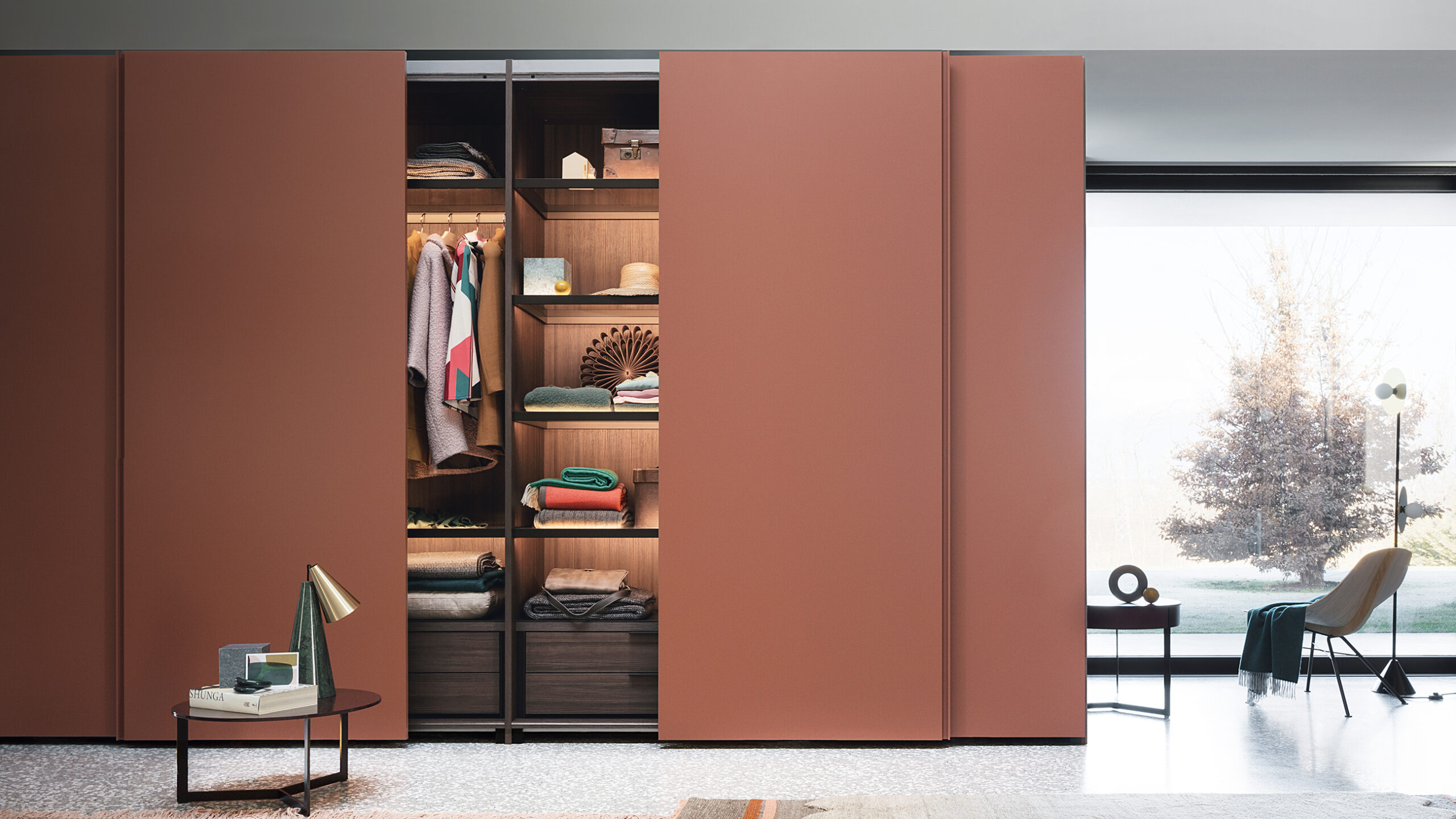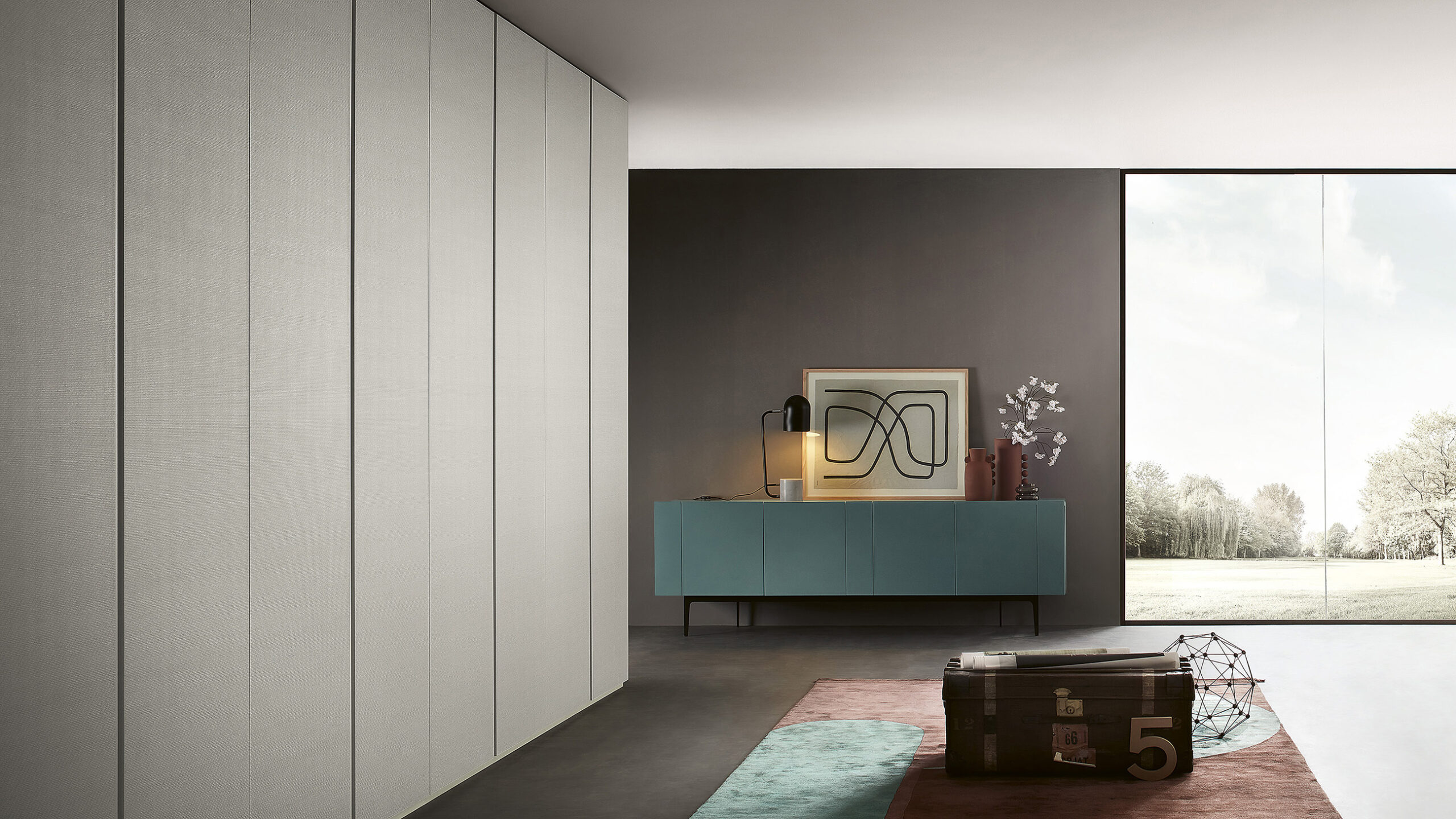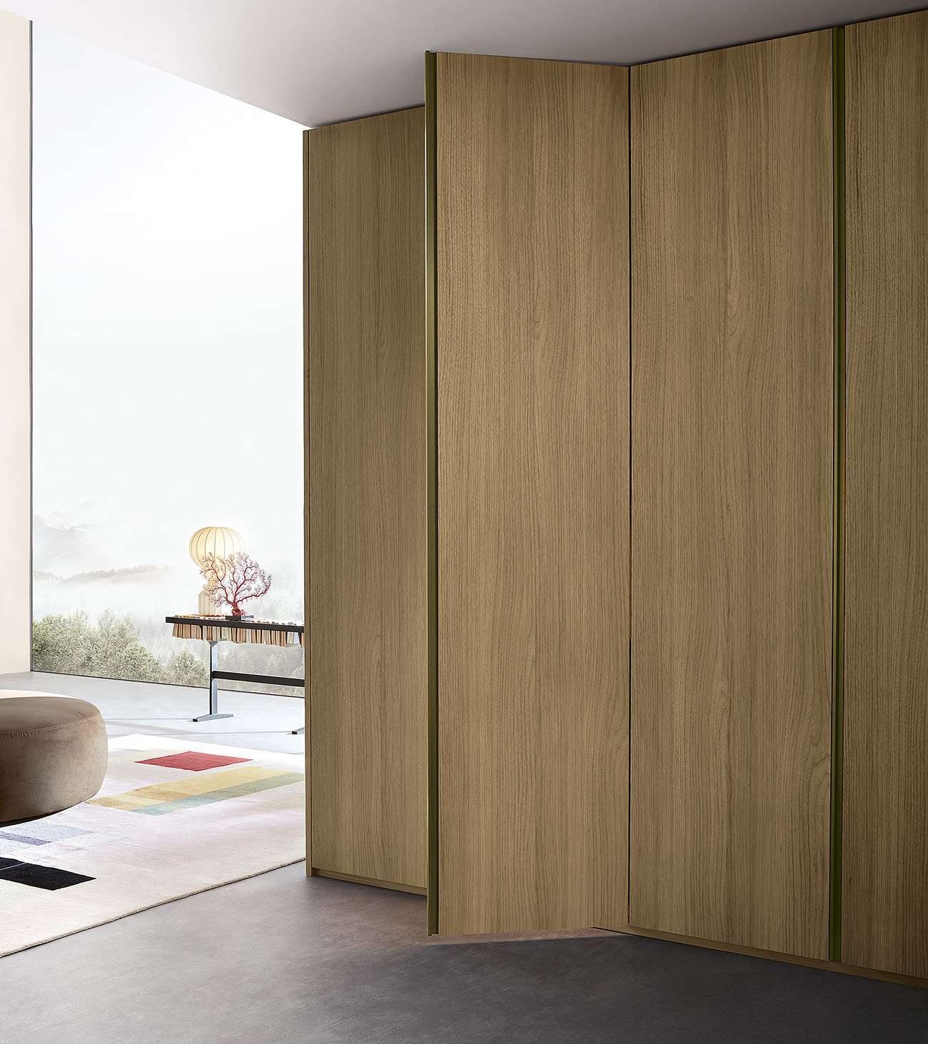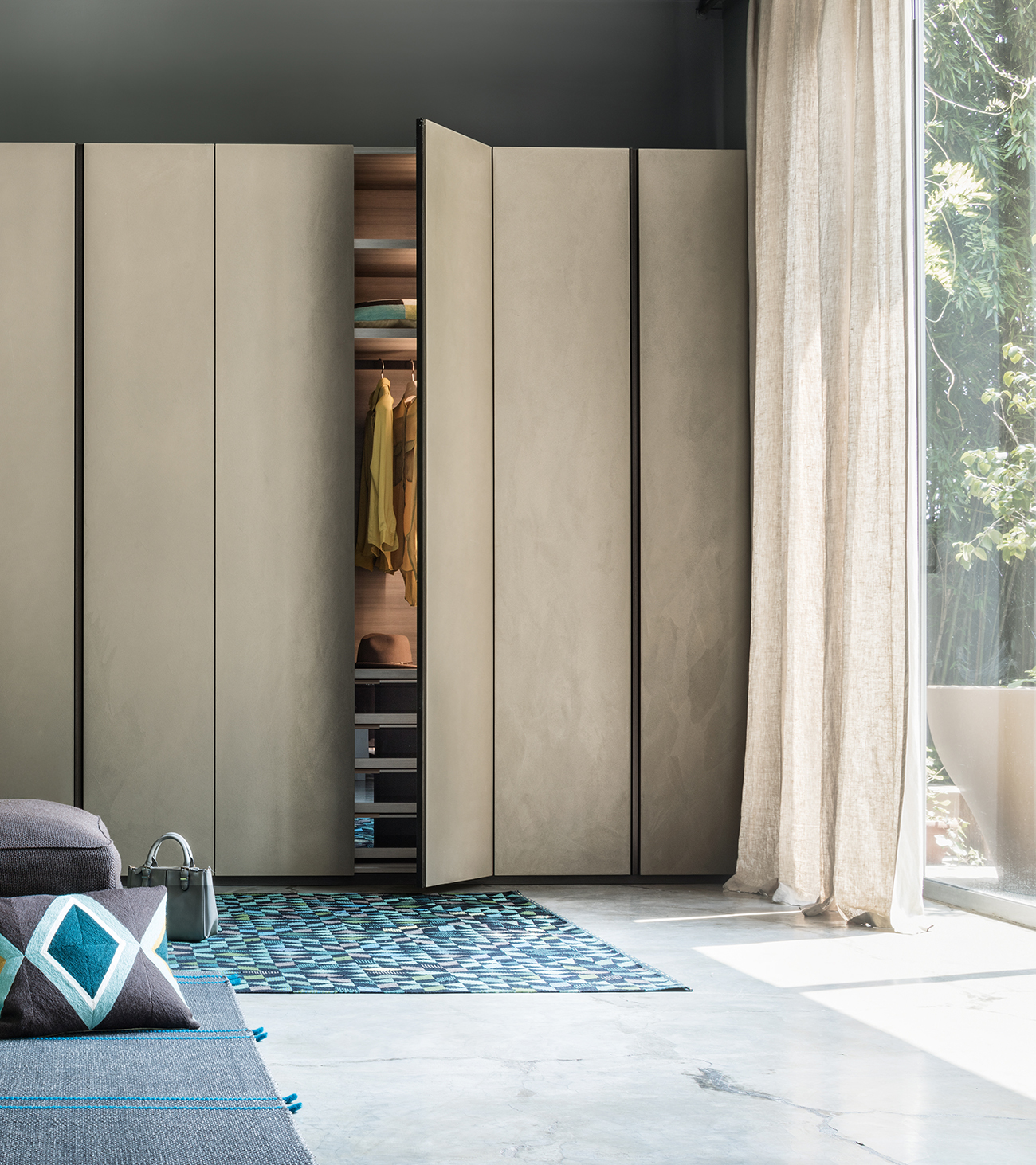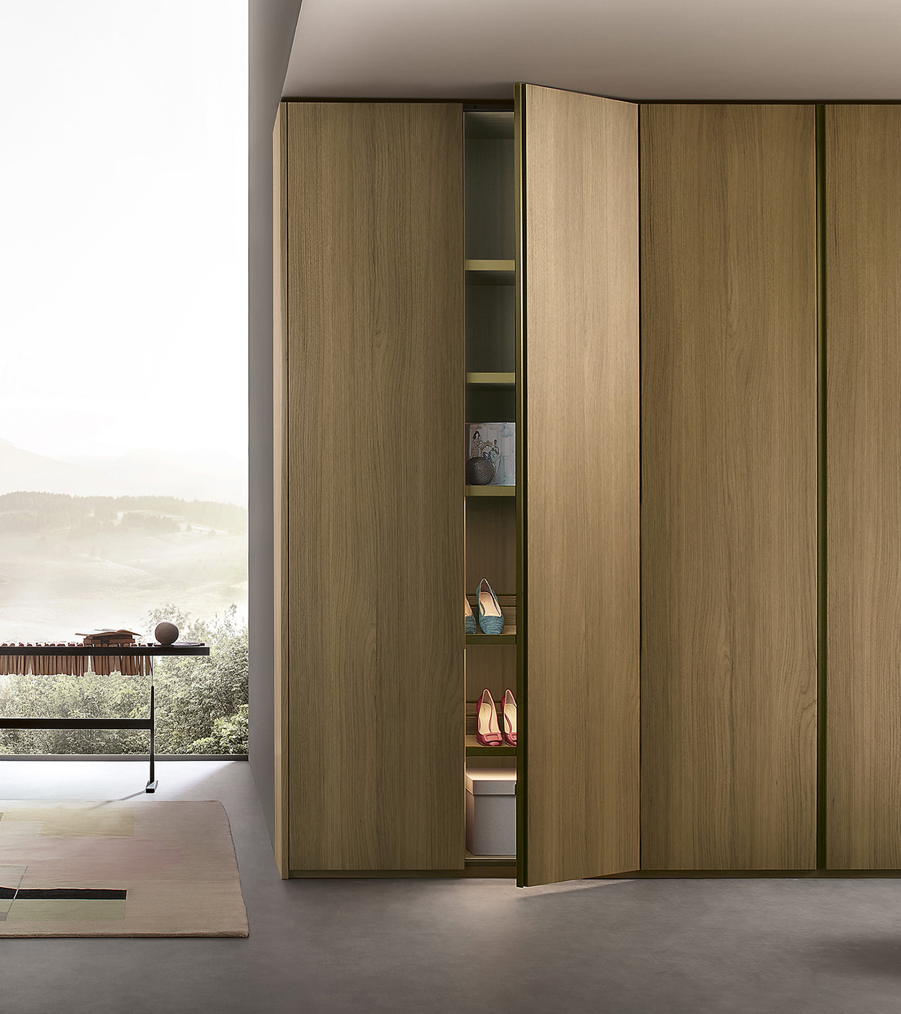 Formal elegance for a bespoke wardrobe with versatile character: the Armadio al Centimetro Text by Officinadesign Lema. The defining feature of the doors is the vertical cut running their full height, which also serves as a handle. Perfect for tailored projects, it is available with hinged, sliding, and coplanar doors. The sophisticated pivot opening system allows the coplanar doors to align on a single plane, offering the aesthetic advantage of a perfectly continuous surface, free from protrusions and recesses.