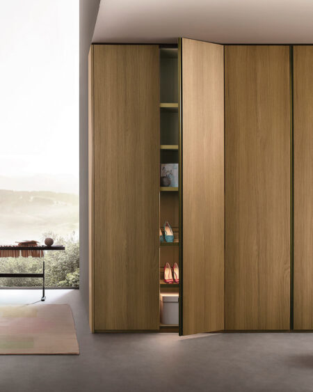 Text can be reduced in height, width, and depth in the hinged door versions. The customization of the exterior is mirrored in the multiple interior personalization options. The Armadio al Centimetro range offers a variety of catalog finishes and a wide selection of accessories designed to optimize space according to specific functional needs: drawer units, trouser racks, belt holders, shoe racks. Shelves and clothes rails with integrated lighting. Not to mention exquisite details in leather and fabric, such as drawer mats and boxes for shirt compartments.