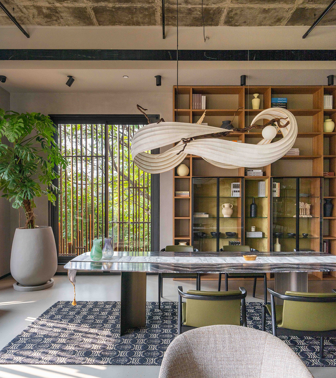 The showroom is located in a strategic position, combining Lema's unique style with details that pay tribute to the local culture. Brightly colored columns, raw concrete ceilings, and expansive floor-to-ceiling windows blur the boundaries between indoors and outdoors, creating a space where contemporary aesthetics and tradition converse.