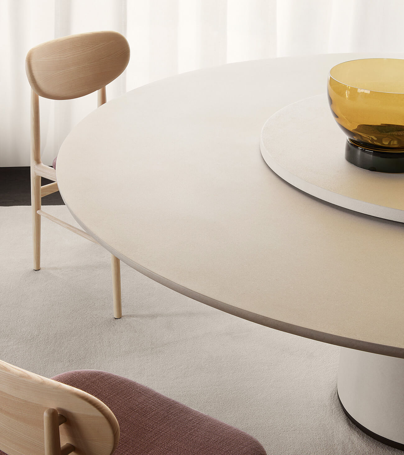 Rencontre entre Orient et Occident, la table à manger Bulè a été conçue avec une référence spécifique aux exigences socioculturelles des marchés orientaux : elle se distingue en effet par le plateau tournant qui peut être posé sur le plateau, parfaite épitomé de la culture culinaire orientale fondée sur l’horizontalité du partage et la simultanéité.