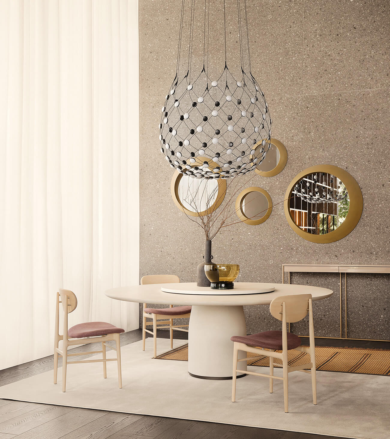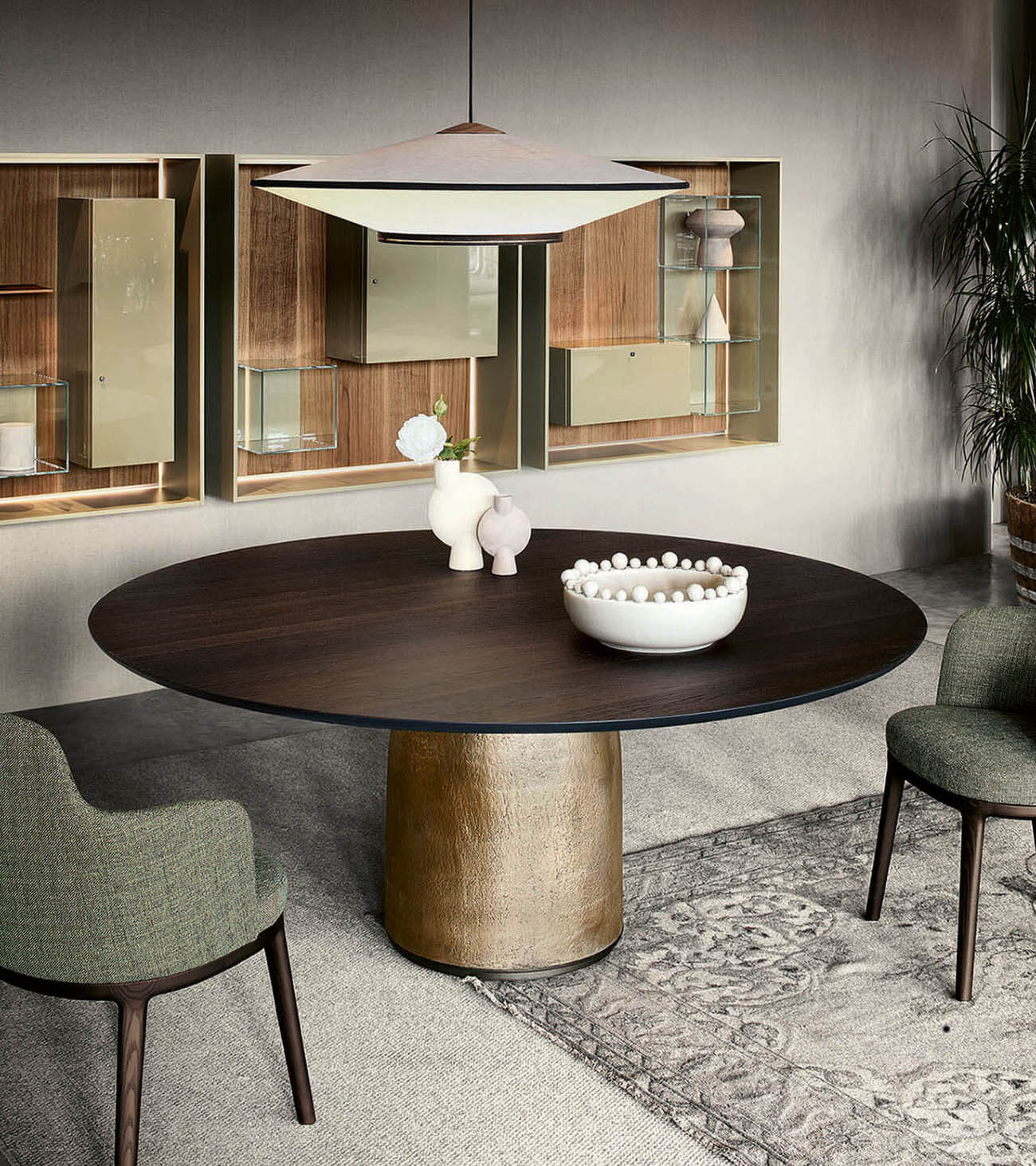 Bulè di LEMA, conçu par Chiara Andreatti, est une table qui réunit des influences orientales et occidentales, avec une base centrale en marbre reconstitué ou en bronze et des moulures en métal peint couleur bronze. Le plateau, disponible en marbre reconstitué ou en chêne thermotraité, est accompagné d’un plateau tournant aux finitions coordonnées, symbole de la culture partagée orientale. La structure, réalisée grâce à un savoir-faire artisanal de haute qualité, utilise des matériaux travaillés avec des techniques innovantes afin de garantir durabilité et durabilité, tout en respectant les normes internationales et le Made in Italy de LEMA.