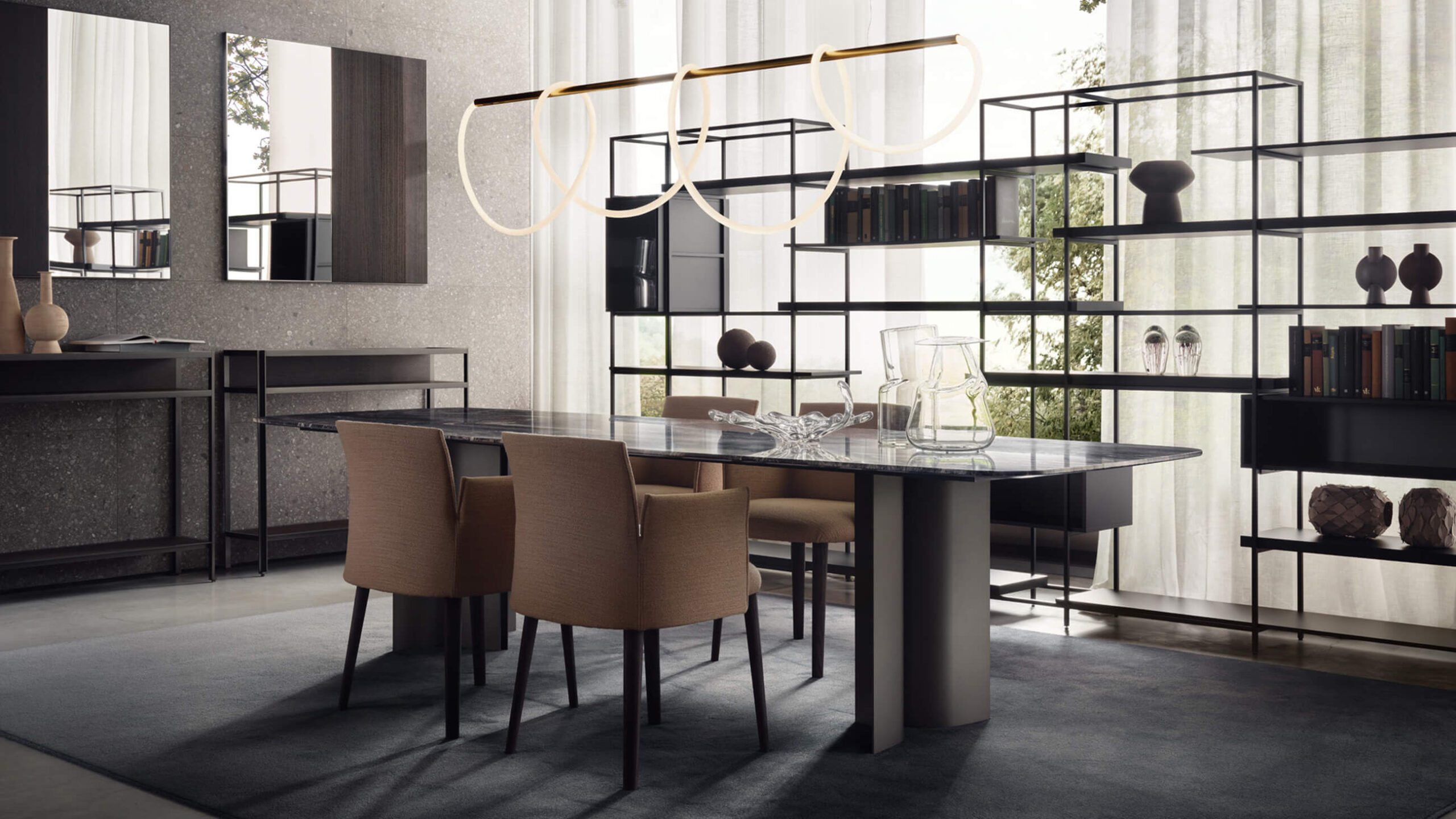 Gullwing est un système de tables né d’une recherche approfondie de Gabriele et Oscar Buratti sur la “complexe essentialité” des formes courbes et sur la valeur en termes de richesse volumétrique qui en découle. Le projet se caractérise par l’association habile des matériaux et par les formes sculpturales de la base qui réagissent avec la lumière et l’espace en générant des jeux d’ombre et de lumière, des reflets et des découpes en mouvement continu.