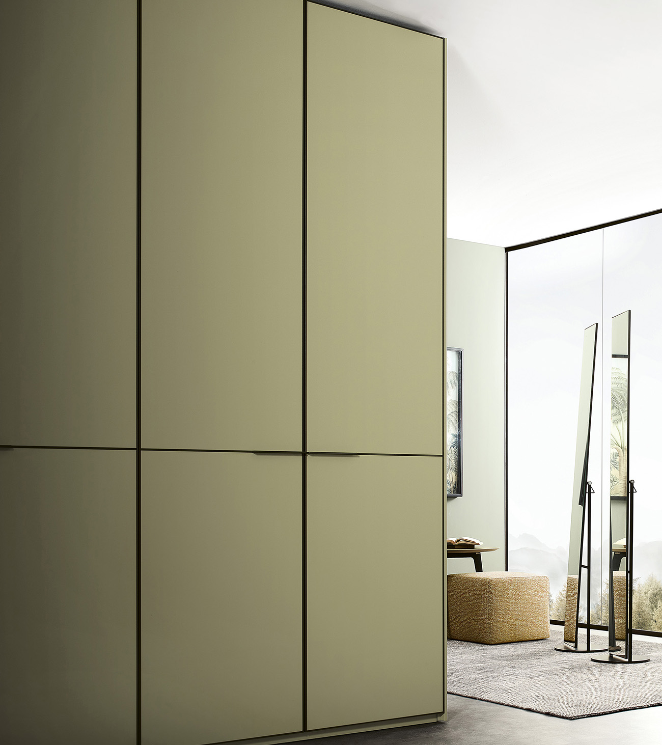 L’armadio su misura Kyn di LEMA, progettato da David Lopez Quincoces, si distingue per le sue ante battenti in melaminico e essenze pregiate, abbinate a profili e maniglie integrate in alluminio bronzo M420 che ne definiscono l’elegante geometria perimetrale. Disponibile con misure personalizzabili in larghezza, altezza e profondità, con cerniere a doppia apertura per soluzioni angolari o lineari. Illuminazione LED integrata per comfort visivo.