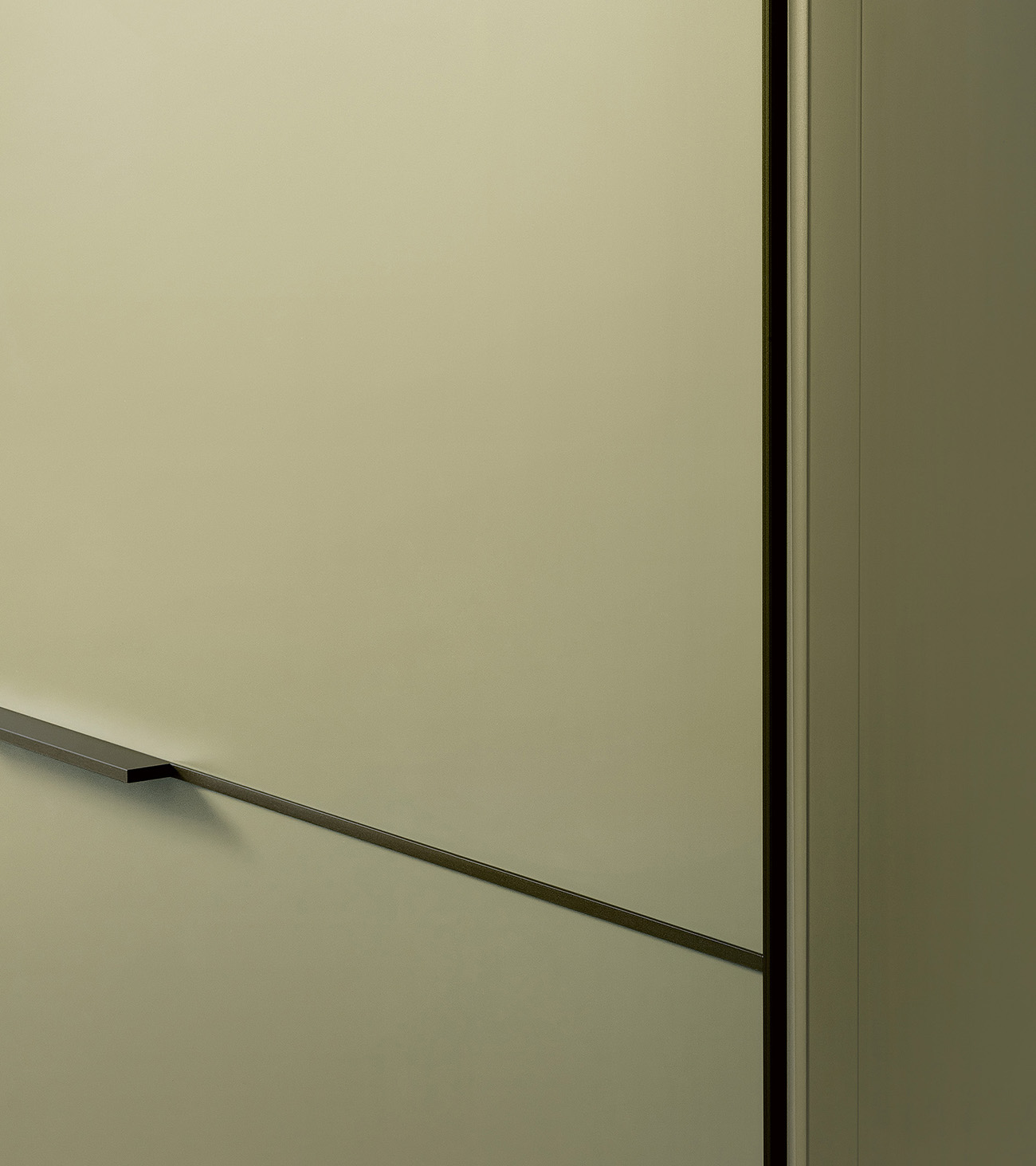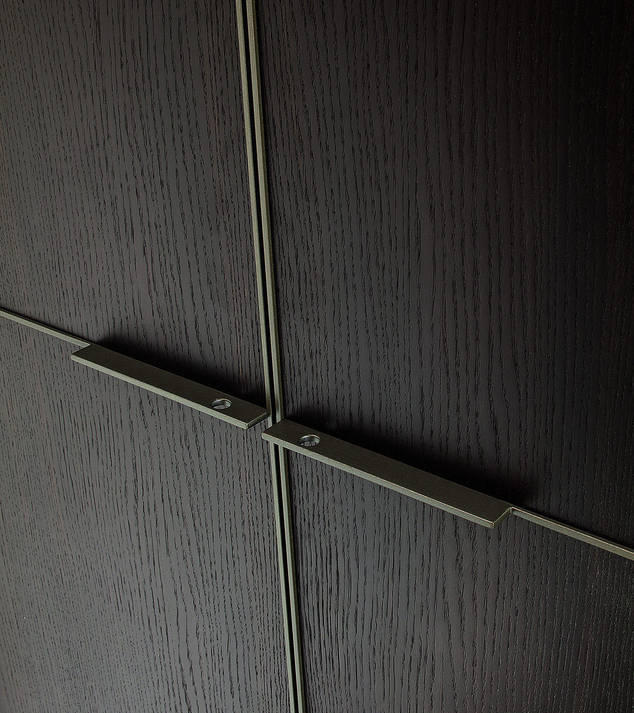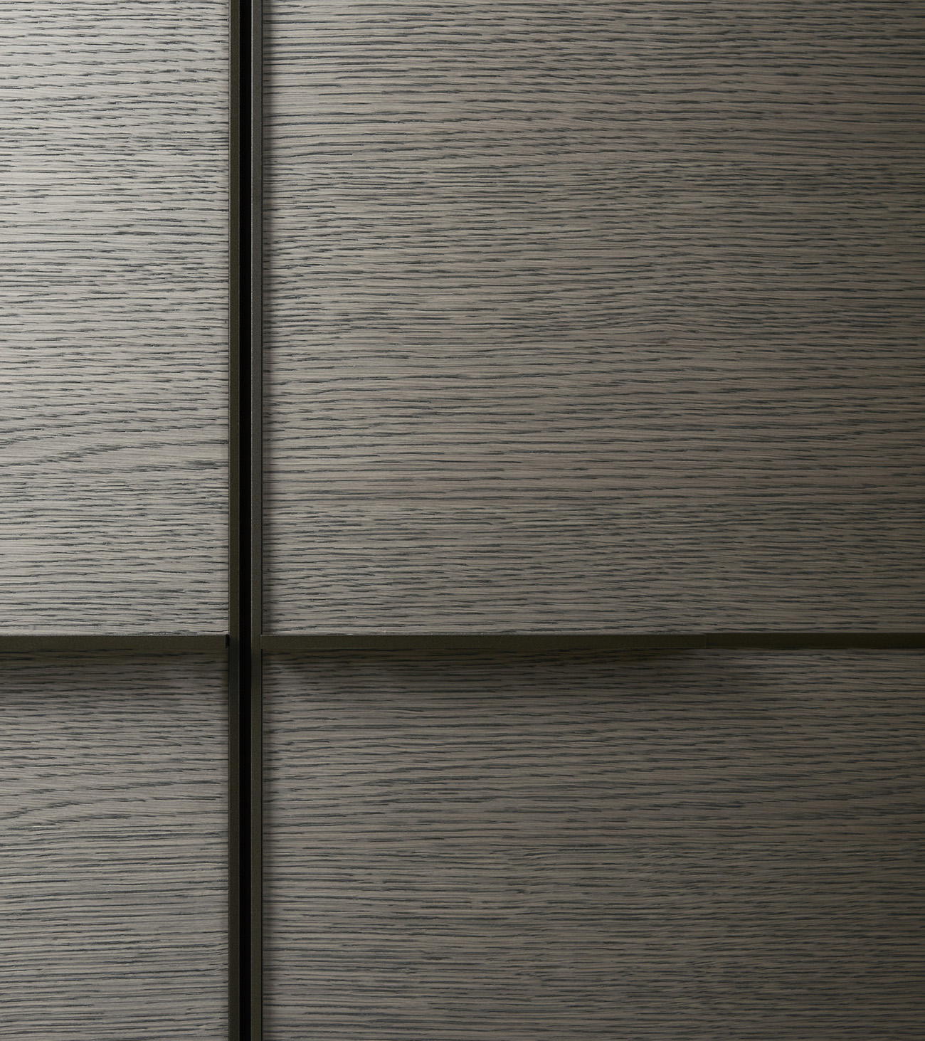Firmato da David Lopez Quincoces, Kyn è un armadio con anta battente dai sofisticati codici estetici contemporanei. Capace di inserirsi in ogni ambiente domestico, si definisce nel dialogo tra i pannelli delle ante proposte in rovere termotrattato e in laccato opaco con il metallo verniciato bronzo del leggero profilo perimetrale che disegna anche le stilizzate maniglie integrate.