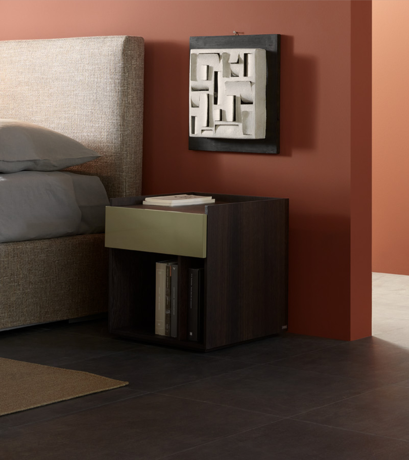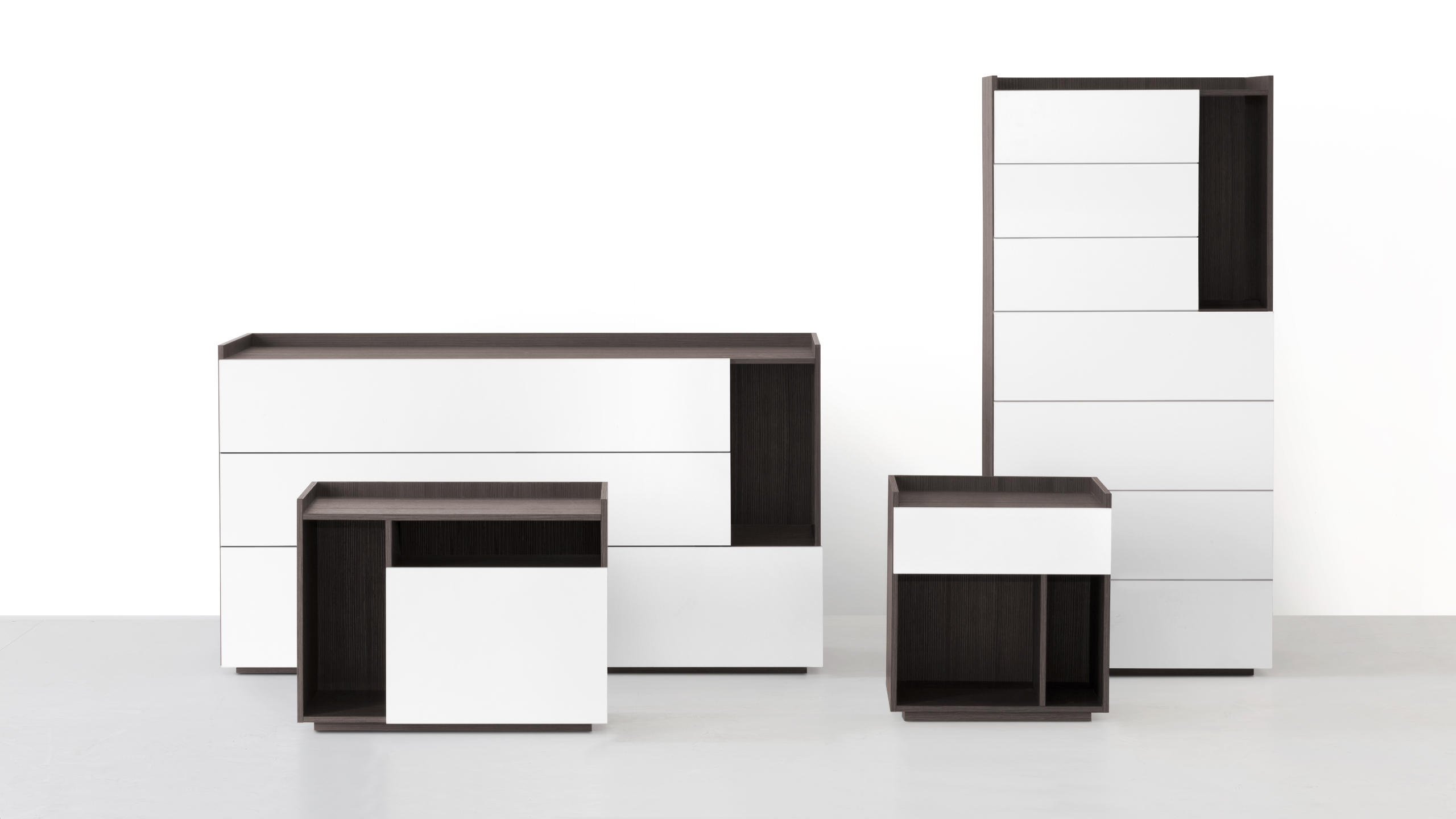 Una proposta dal linguaggio contemporaneo ed essenziale costruita intorno ad una sequenza di pieni e vuoti segnati dal mix tra il rovere termotrattato della struttura e i frontali dei cassetti disponibili in laccato lucido e opaco oltre che in Noce Canaletto e nella sofisticata finitura Argilla, morbida e setosa al tatto e alla vista.