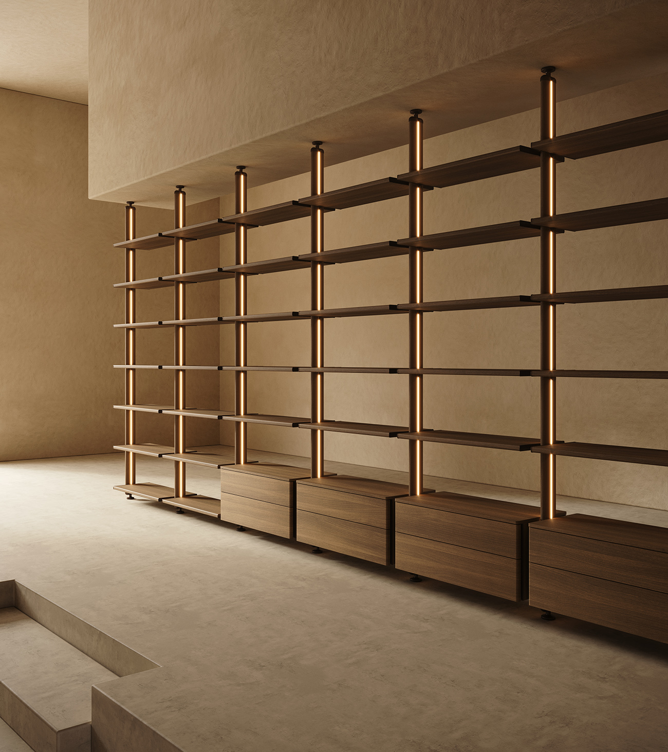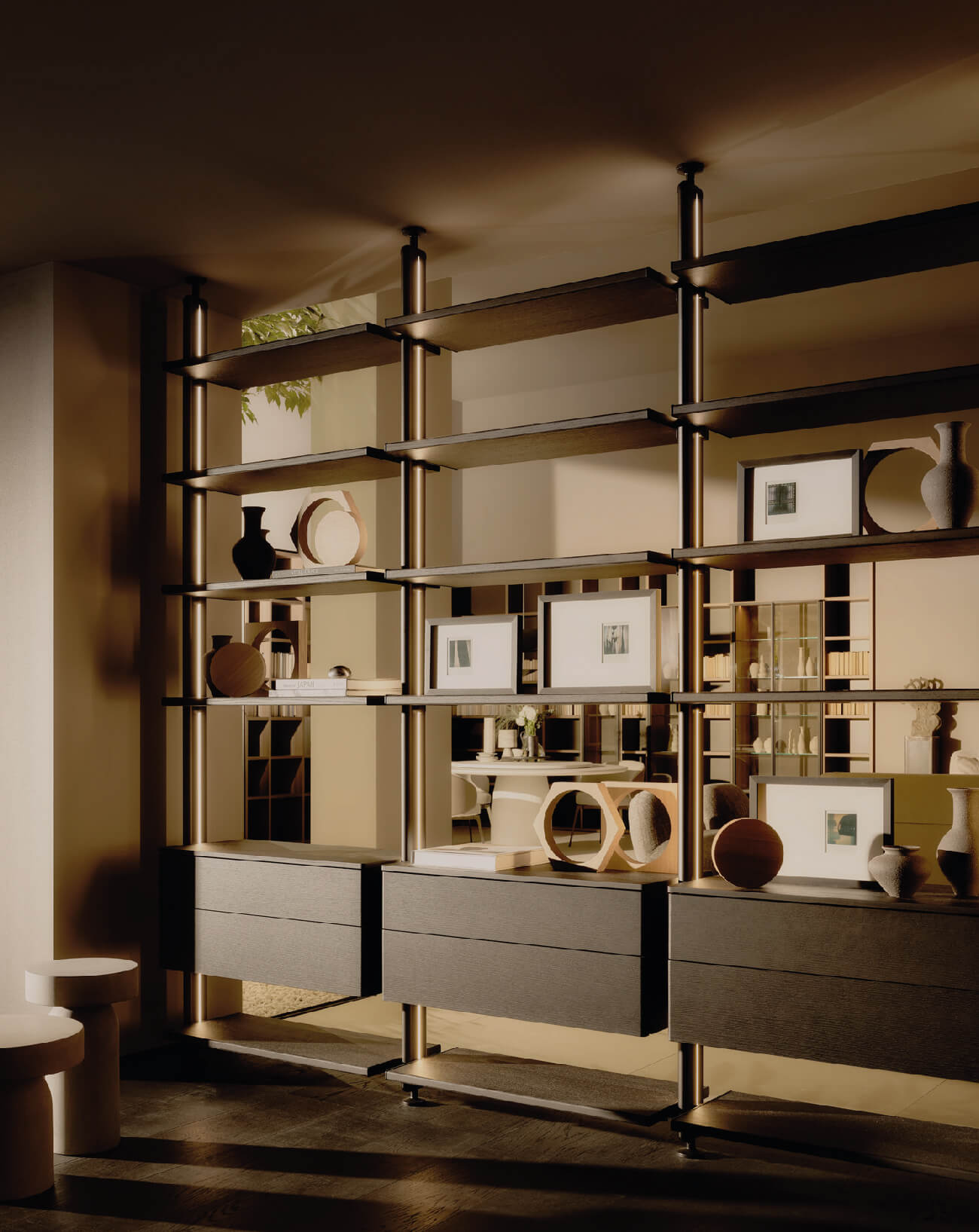 L25 è un innovativo sistema freestanding che unisce modularità, eleganza e intelligenza progettuale, trasformando gli spazi dell’abitare con soluzioni trasversali e altamente versatili. Composta da contenitori e ripiani, L25 si distingue per la scansione ritmica dei montanti in alluminio estruso, elementi portanti disponibili con fissaggio a pavimento-soffitto o a pavimento-parete.