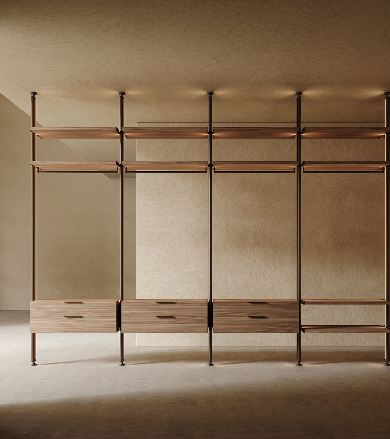 Il sistema L25 di LEMA, disegnato da Officinadesign Lema, è perfettamente adattabile sia alla zona giorno che alla zona notte, garantendo continuità estetica e funzionale. Nella versione giorno, riprende la griglia del sistema Selecta, accogliendo ripiani e moduli contenitori con cassetti o ribalte. Nella configurazione notte, si integra armoniosamente con la cabina VentiTre, mantenendone proporzioni, finiture e soluzioni tecniche, con una maggiore capacità contenitiva. Un sistema sofisticato e flessibile, progettato per definire e organizzare gli ambienti con coerenza stilistica ed estrema libertà compositiva.