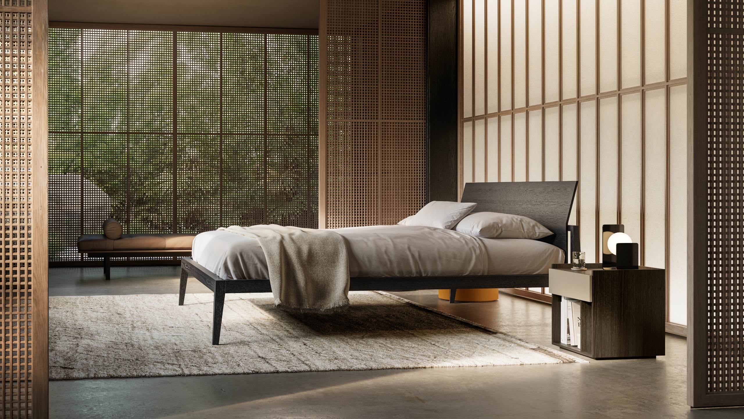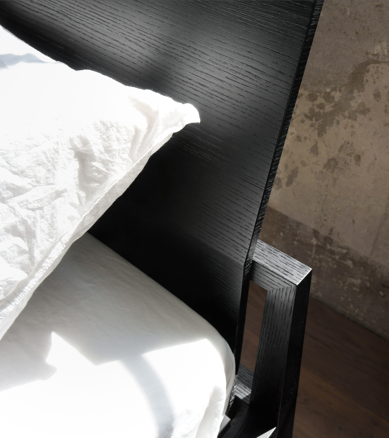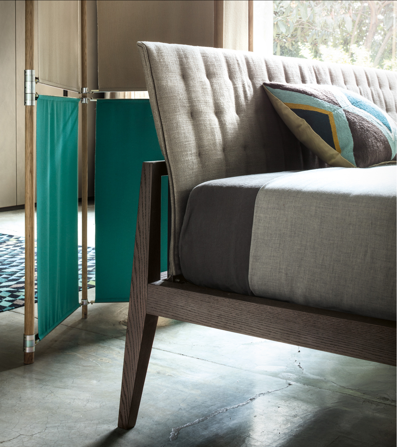 La peculiarità del progetto è la testiera inclinata, sempre in legno ma dal profilo più sottile che crea un armonico contrasto con la struttura interrompendone la linearità delle forme. Per una proposta più morbida, la testiera può essere arricchita dal raffinato rivestimento in tessuto impunturato.