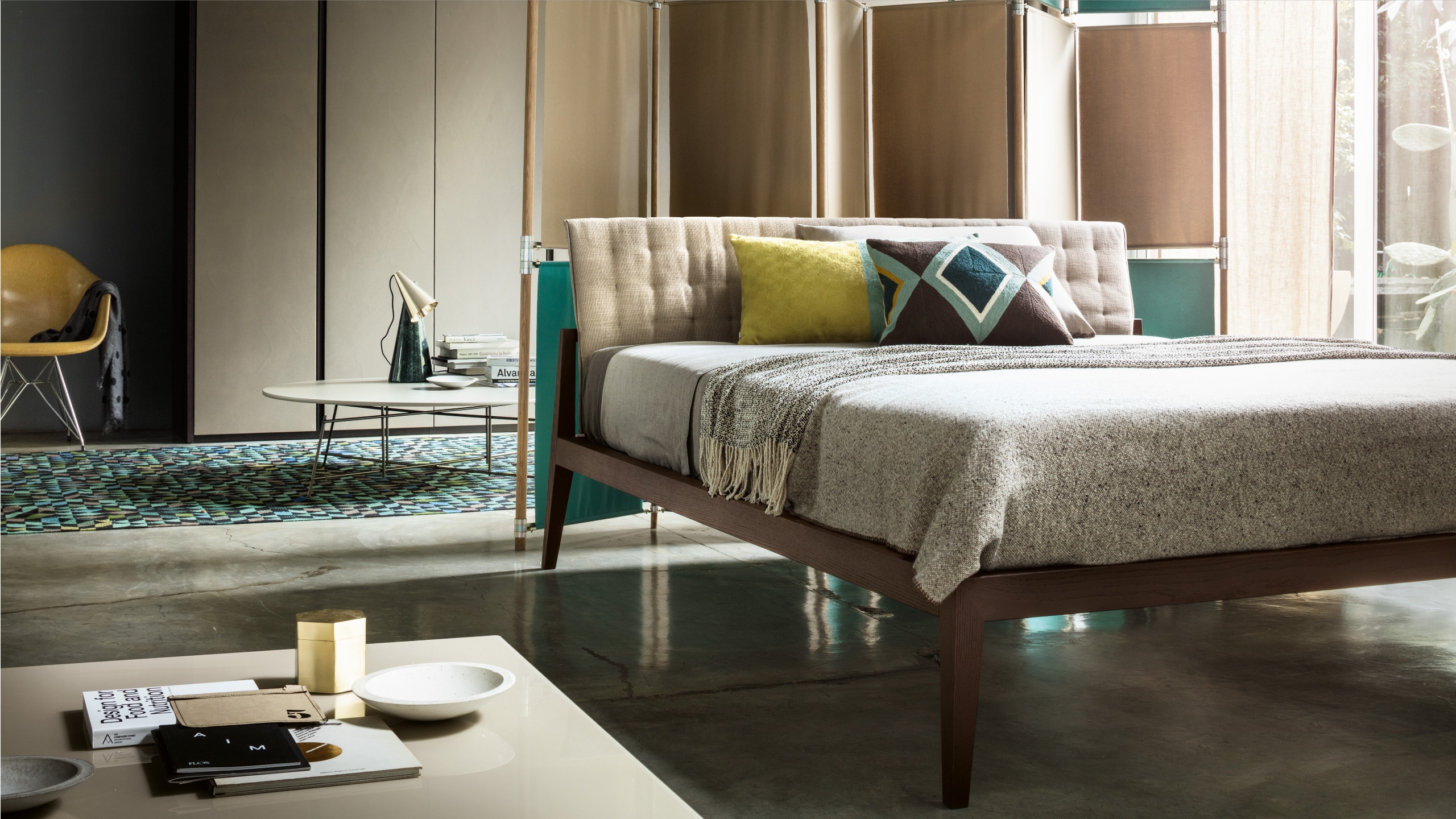 Nella perfetta tradizione Lema, il letto Theo disegnato da Studio Kairos abbina la ricchezza e il calore del legno della struttura aerea con il rigore e la massima pulizia formale delle linee.