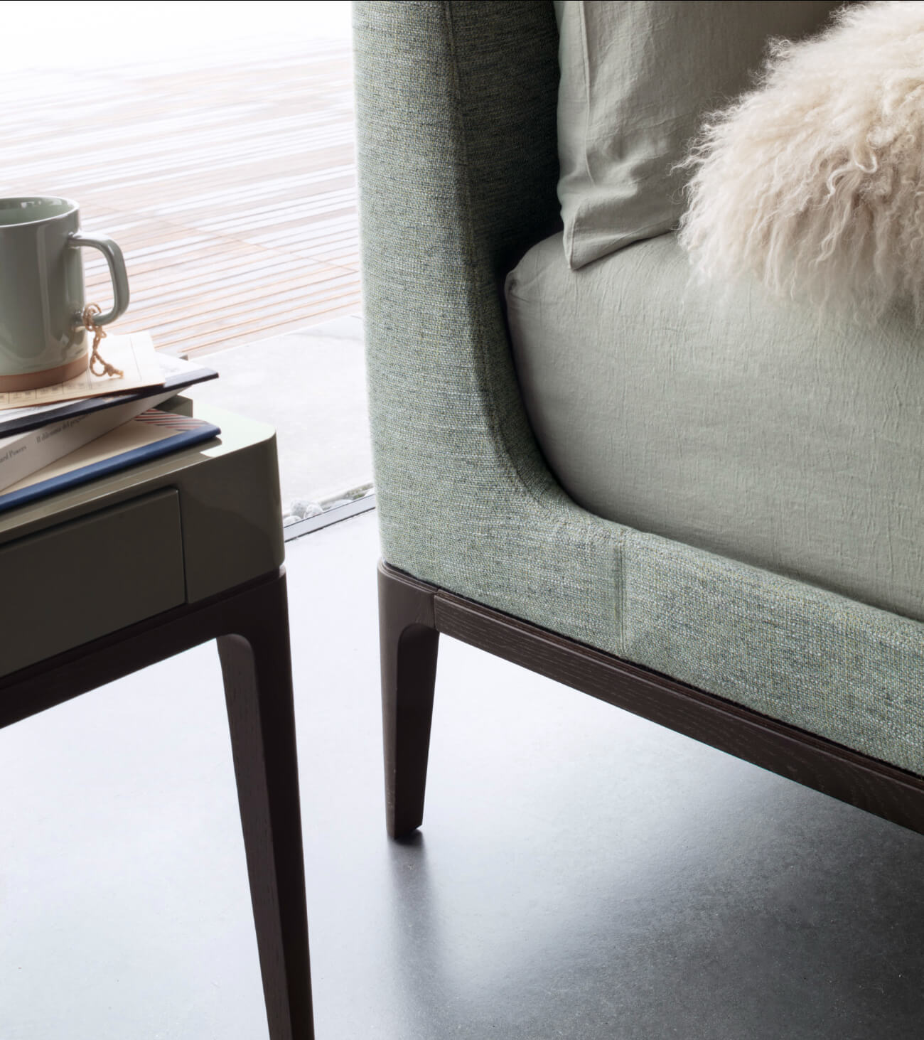Dalla presenza regale, Victoriano, letto tessile con struttura in massello, trae ispirazione dagli stilemi del passato, attualizzati nel disegno. A caratterizzare fortemente il progetto, l’alta testata leggermente curvata ai lati per accogliere dolcemente il materasso, impreziosita dalla cucitura centrale impunturata.